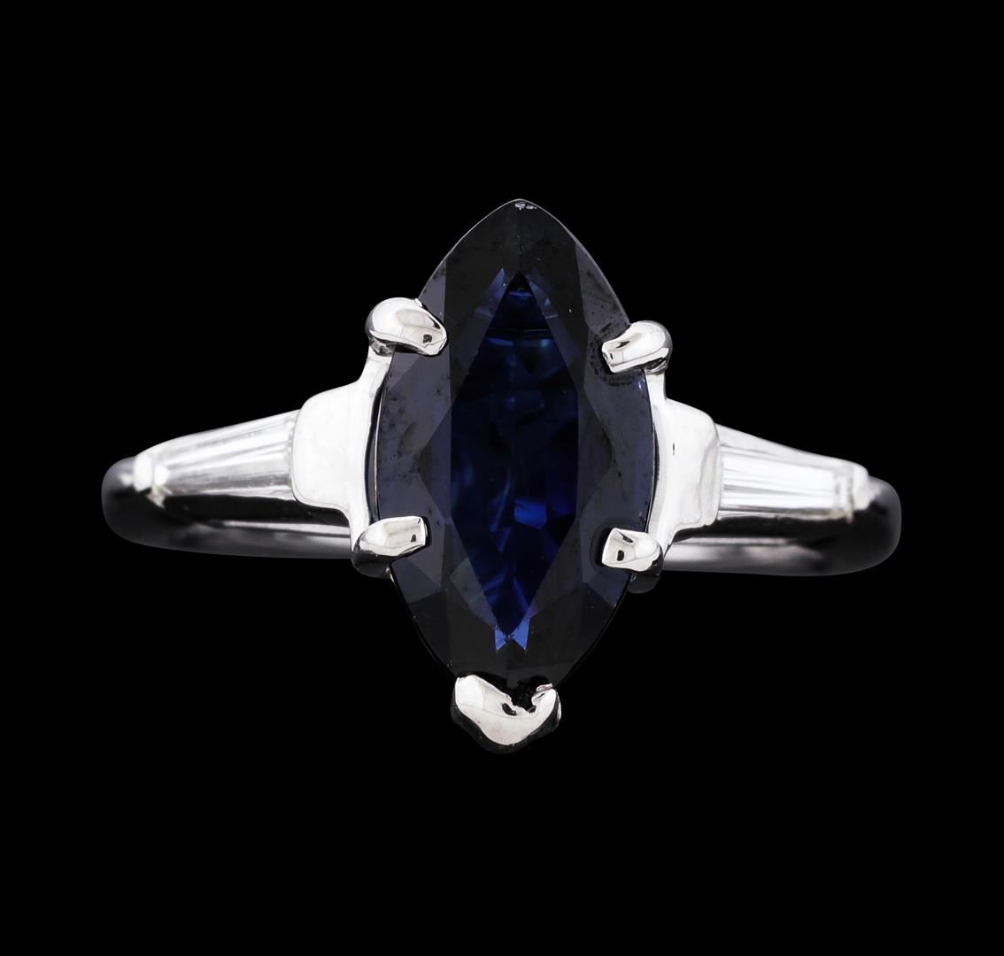 One electronically tested 14KT white gold lady's cast fashion ring with a cathedral shank with a bright polish finish. The featured lady's ring has a shank measuring 1.22 millimeters wide. Identified with markings of "14K". Condition is like new, good workmanship. Containing: One prong set marquise modified mixed cut natural blue sapphire, measuring 11.80 x 6.30 x 3.21mm, (depth est.) 10%. bulge factor, approximate weight of 2.13ct., clarity is eye clean, dark, very slightly grayish, blue color, (GIA B 7/3), cut is good. Transmitting light with no distortion, transparent. Colored gemstones are presumed to have been subjected to commonly used enhancement processes. Graded in the setting. Two channel set baguette cut (tapered) diamonds, measuring from 5.15 x 1.35 x 1.15mm (depth est.) to 5.20 x 1.40 x 1.19mm (depth est.) approximate total weight of 2 Stones = 0.15ct. Graded in the setting. Clarity: VS-1 to VS-2. Color: G - HCut Very Good. Total Weight of Colored Stones 2.13ct. Total Weight of Diamonds 0.15ct. Total Weight of Ring 4.60gm. GAS Appraised.
