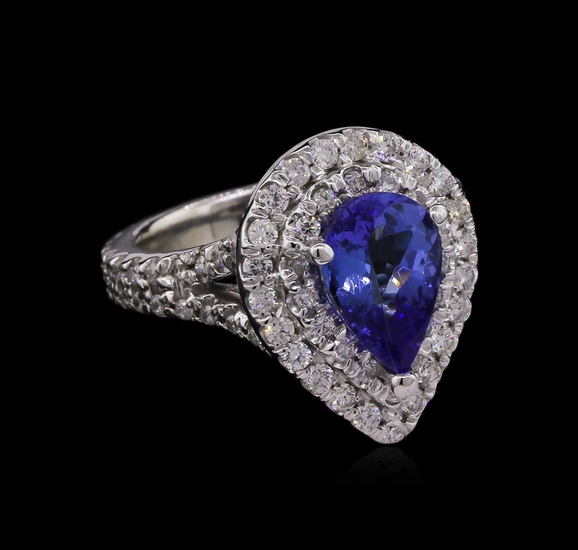 One electronically tested 14KT white gold lady's cast fashion ring with a split shank with a bright polish finish. The featured lady's ring has a shank measuring 3.47 millimeters wide. Identified with markings of "14K". Condition is new, good workmanship. Containing: One prong set pear modified brilliant cut natural tanzanite, measuring 10.70 x 7.26 x 4.14mm, approximate weight of 2.15ct., clarity is eye clean, type I, medium, very slightly grayish, violetish blue color, (GIA vB 5/3), cut is very good. Transmitting light with no distortion, transparent. Colored gemstones are presumed to have been subjected to commonly used enhancement processes. Graded in the setting. Twenty-Three prong set round brilliant cut diamonds, measuring 1.80 - 1.70 x 1.05mm (depth est.) approximate total weight of 23 Stones = 0.44ct. Graded in the setting. Clarity: SI-1 to SI-2 . Color: H - I. Cut Good Sixty-Four prong set round brilliant cut diamonds, measuring 1.50 - 1.30 x 0.85mm (depth est.) approximate total weight of 64 Stones = 0.65ct. Graded in the setting. Clarity: SI-1 to I-1 . Color: H - I. Cut Good. Total Weight of Colored Stones 2.15ct. Total Weight of Diamonds 1.09ct. Total Weight of Ring 9.20 grams. GAS Appraised.