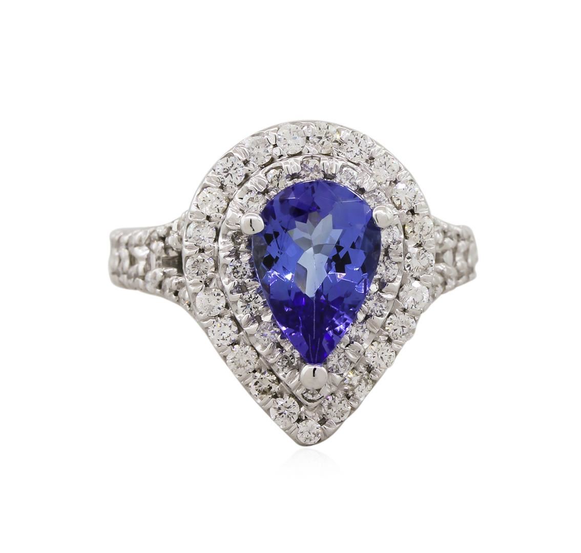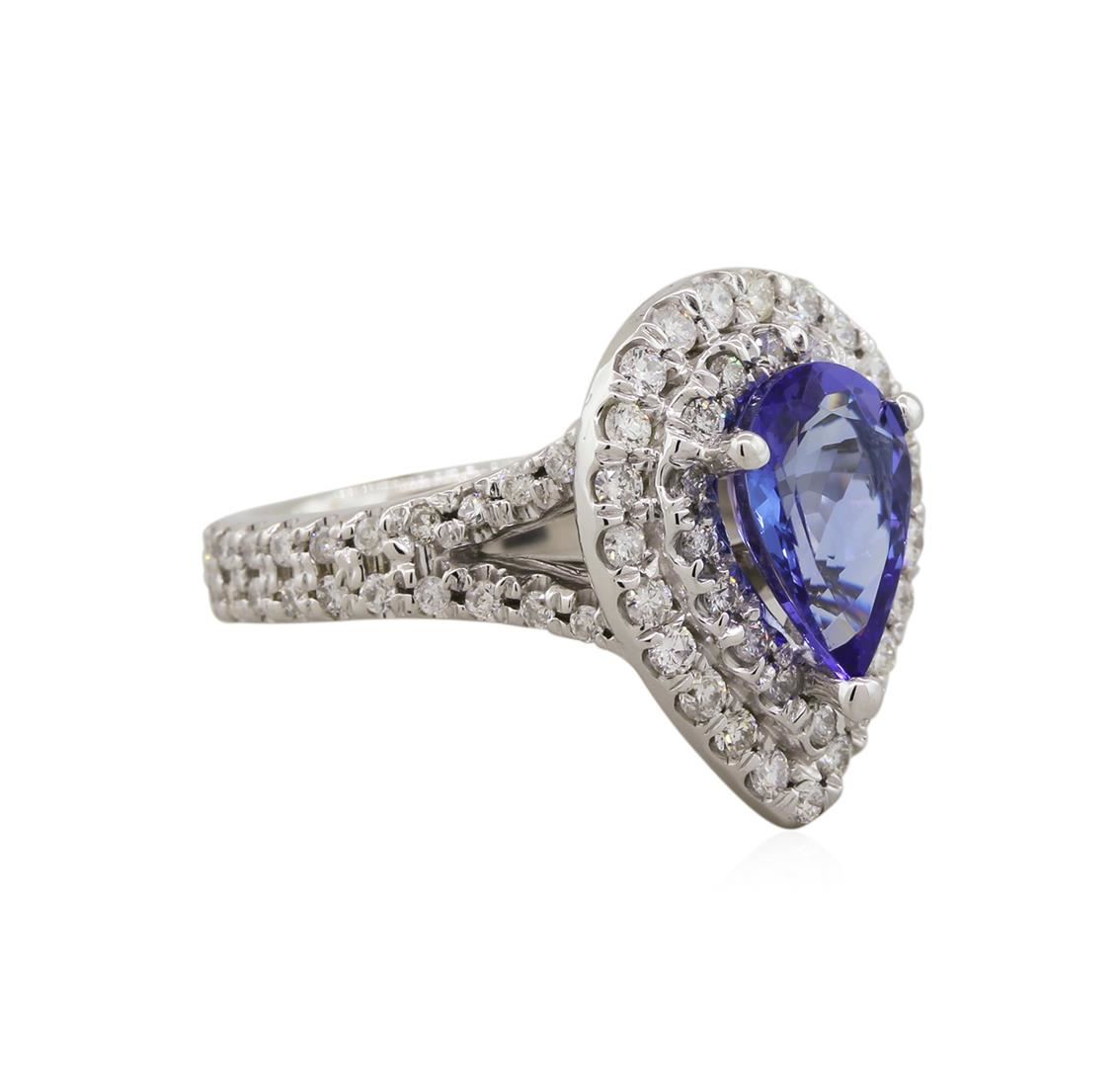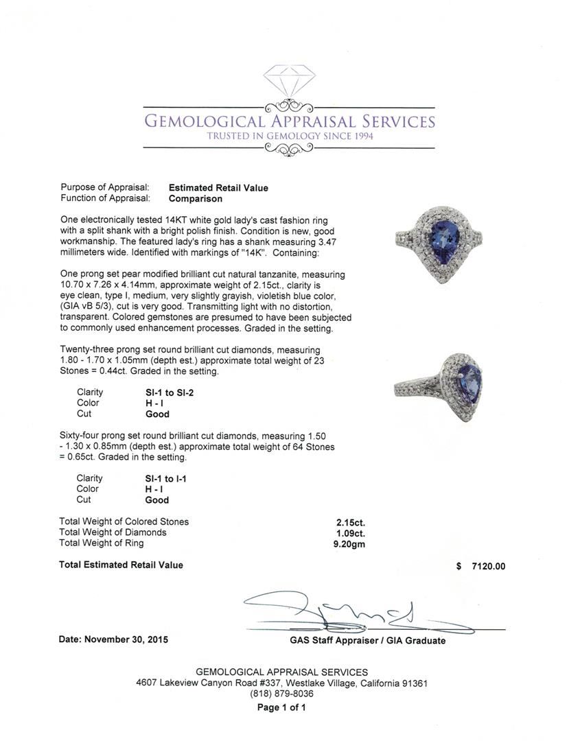 One electronically tested 14KT white gold lady's cast fashion ring with a split shank with a bright polish finish. The featured lady's ring has a shank measuring 3.47 millimeters wide. Identified with markings of "14K". Condition is new, good workmanship. Containing: One prong set pear modified brilliant cut natural tanzanite, measuring 10.70 x 7.26 x 4.14mm, approximate weight of 2.15ct., clarity is eye clean, type I, medium, very slightly grayish, violetish blue color, (GIA vB 5/3), cut is very good. Transmitting light with no distortion, transparent. Colored gemstones are presumed to have been subjected to commonly used enhancement processes. Graded in the setting. Twenty-Three prong set round brilliant cut diamonds, measuring 1.80 - 1.70 x 1.05mm (depth est.) approximate total weight of 23 Stones = 0.44ct. Graded in the setting. Clarity: SI-1 to SI-2 . Color: H - I. Cut Good Sixty-Four prong set round brilliant cut diamonds, measuring 1.50 - 1.30 x 0.85mm (depth est.) approximate total weight of 64 Stones = 0.65ct. Graded in the setting. Clarity: SI-1 to I-1 . Color: H - I. Cut Good. Total Weight of Colored Stones 2.15ct. Total Weight of Diamonds 1.09ct. Total Weight of Ring 9.20 grams. GAS Appraised at $7,120.00.