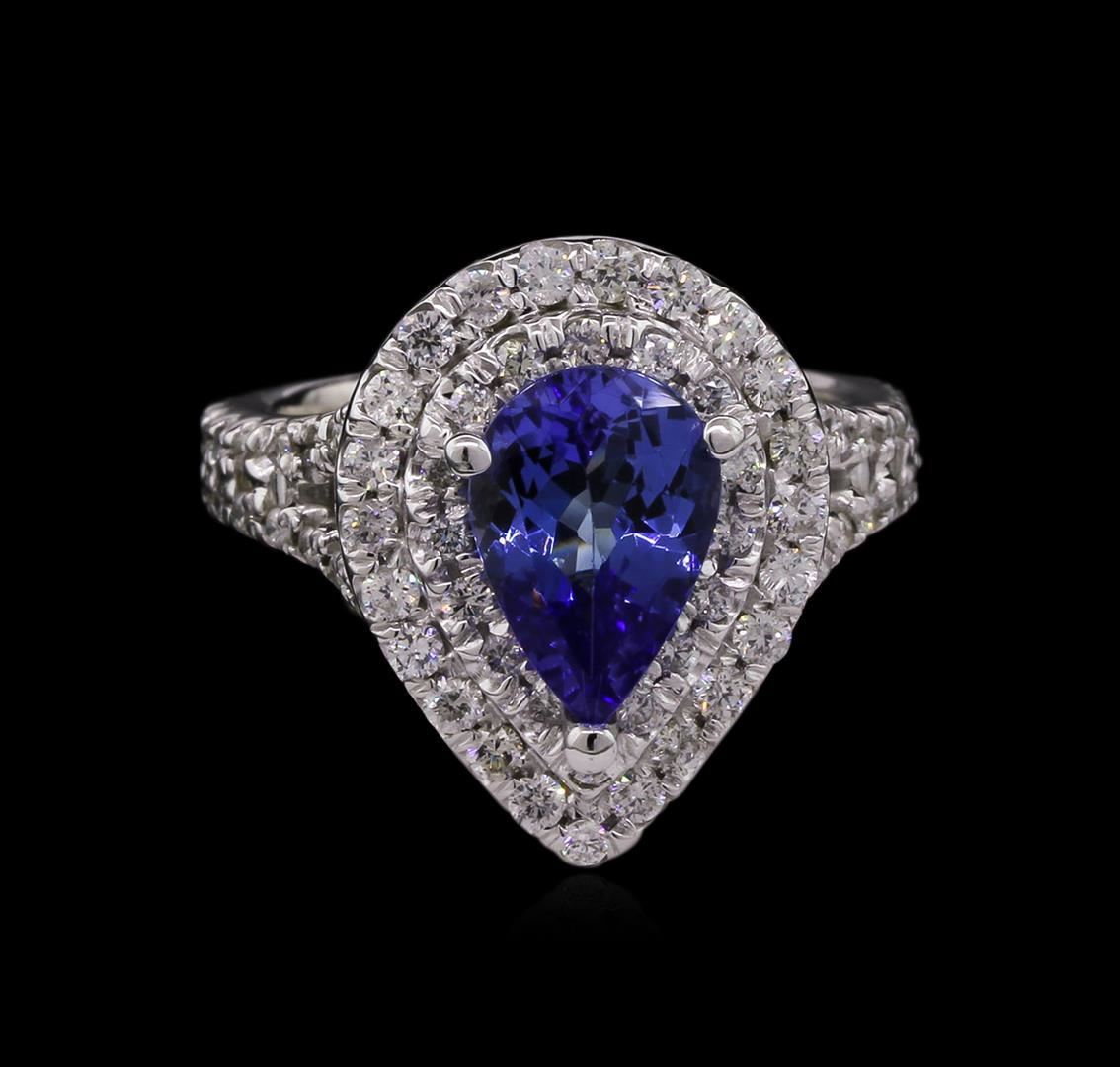 One electronically tested 14KT white gold lady's cast fashion ring with a split shank with a bright polish finish. The featured lady's ring has a shank measuring 3.47 millimeters wide. Identified with markings of "14K". Condition is new, good workmanship. Containing: One prong set pear modified brilliant cut natural tanzanite, measuring 10.70 x 7.26 x 4.14mm, approximate weight of 2.15ct., clarity is eye clean, type I, medium, very slightly grayish, violetish blue color, (GIA vB 5/3), cut is very good. Transmitting light with no distortion, transparent. Colored gemstones are presumed to have been subjected to commonly used enhancement processes. Graded in the setting. Twenty-Three prong set round brilliant cut diamonds, measuring 1.80 - 1.70 x 1.05mm (depth est.) approximate total weight of 23 Stones = 0.44ct. Graded in the setting. Clarity: SI-1 to SI-2 . Color: H - I. Cut Good Sixty-Four prong set round brilliant cut diamonds, measuring 1.50 - 1.30 x 0.85mm (depth est.) approximate total weight of 64 Stones = 0.65ct. Graded in the setting. Clarity: SI-1 to I-1 . Color: H - I. Cut Good. Total Weight of Colored Stones 2.15ct. Total Weight of Diamonds 1.09ct. Total Weight of Ring 9.20 grams. GAS Appraised at $7,120.00.