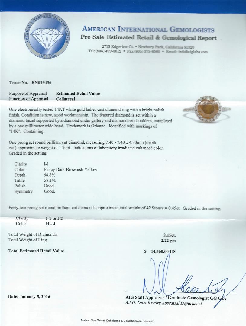 One electronically tested 14KT white gold ladies cast diamond ring with a bright polish finish. The featured diamond is set within a diamond bezel supported by a diamond under gallery and diamond set shoulders, completed by a one millimeter wide band. Trademark is Orianne. Identified with markings of "14K". Condition is new, good workmanship. Containing: One prong set round brilliant cut diamond, measuring 7.40 - 7.40 x 4.80mm (depth est.) approximate weight of 1.70ct. Indications of laboratory irradiated enhanced color. Graded in the setting. Clarity I-1. Color: Fancy Dark Brownish Yellow. Depth: 64.8%. Table: 58.1%. Polish Good Symmetry Good. Forty-Two prong set round brilliant cut diamonds approximate. Total Weight of 42 Stones = 0.45ct. Graded in the setting. Clarity: I-1 to I-2. Color: H - J. Total Weight of Diamonds 2.15ct. Total Weight of Ring 2.22gm. AIG Appraised at $14,460.00.