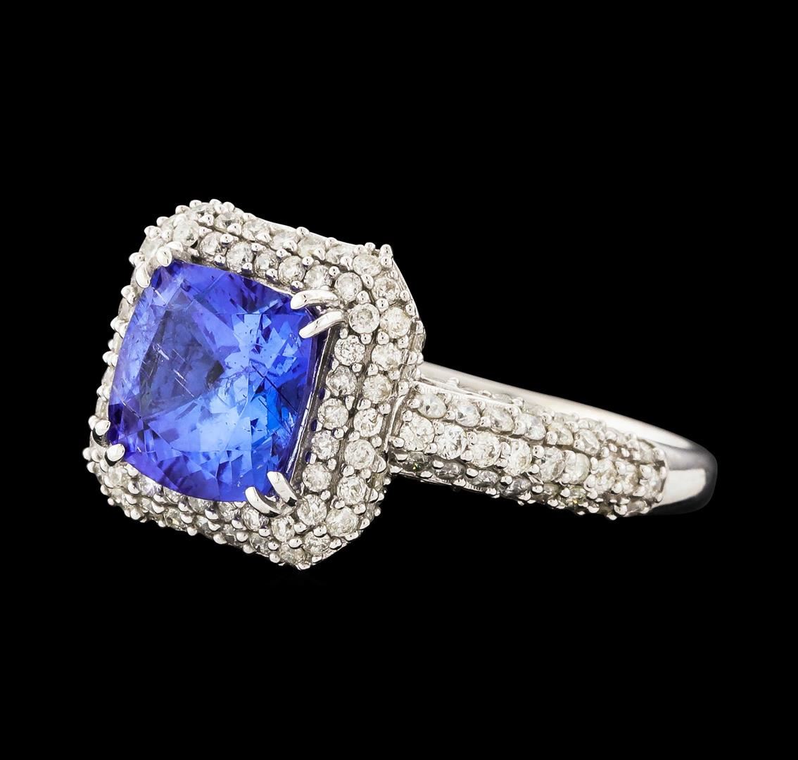One electronically tested 14KT white gold ladies cast tanzanite and diamond ring with a bright polish finish. The featured tanzanite is set within tiered diamond bezels supported by a diamond set under gallery and diamond set shoulders, completed by a two millimeter wide band. Trademark is Orianne. Identified with markings of "14K". Condition is new, good workmanship. Containing: One prong set square cushion mixed cut natural tanzanite approximate weight of 2.16ct., clarity is moderately included, type I, medium, very slightly grayish, violetish blue color, (GIA vB 5/3), cut is good. Transmitting light with a minimum of distortion, transparent. Naturally occurring internal & external characteristics are present. Graded in the setting. Tanzanite is a very rare gemstone that is only found in the country of Tanzania. Originally discovered in 1967. Tiffany & Company, named the stone Tanzanite. It is found in the Usumburu Mountains that border the Umba Valley of northern Tanzania. Tanzanite occurs in gray, brown, violet, blue, reddish-purple, & green. The gem is interesting because of its exceptional pleochroism. Rotated in different directions a tanzanite will exhibit multiple changes of color. Tanzanite has a low tolerance to ultrasonic cleaning, and should not be cleaned using this method. One Hundred Seventy-Two prong set round brilliant cut diamonds approximate total weight of 172 Stones = 1.01ct. Graded in the setting. Clarity: I-1 to I-2. Color: G - I. Total Weight of Colored Stones 2.16ct. Total Weight of Diamonds 1.01ct. Total Weight of Ring 4.72gm. AIG Appraised.