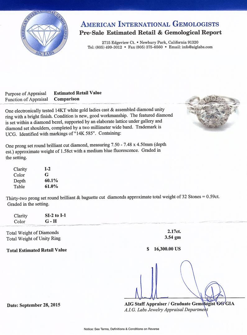 One electronically tested 14KT white gold ladies cast & assembled diamond unity ring with a bright finish. The featured diamond is set within a diamond bezel, supported by an elaborate lattice under gallery and diamond set shoulders, completed by a two millimeter wide band. Trademark is UCG. Identified with markings of "14K 585". Condition is new, good workmanship. Containing: One prong set round brilliant cut diamond, measuring 7.50 - 7.48 x 4.50mm (depth est.) approximate weight of 1.58ct with a medium blue fluorescence. Graded in the setting. Clarity: I-2. Color: GDepth 60.1%. Table 61.0%. Thirty-Two prong set round brilliant & baguette cut diamonds approximate. Total Weight of 32 Stones = 0.59ct. Graded in the setting. Clarity: SI-2 to I-1. Color: G - H. Total Weight of Diamonds 2.17ct. Total Weight of Unity Ring 3.54gm. AIG Appraised at $16,300.00.