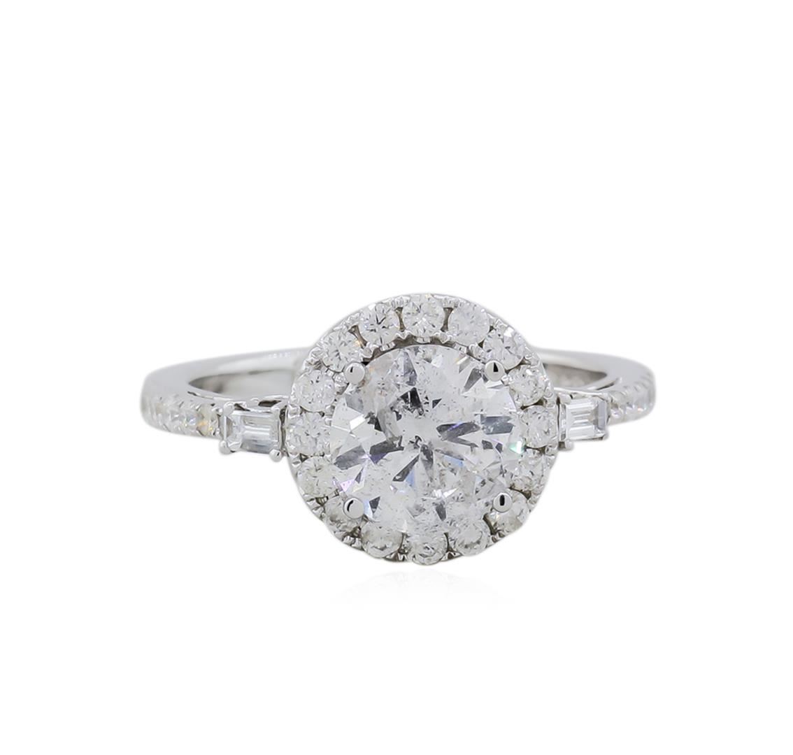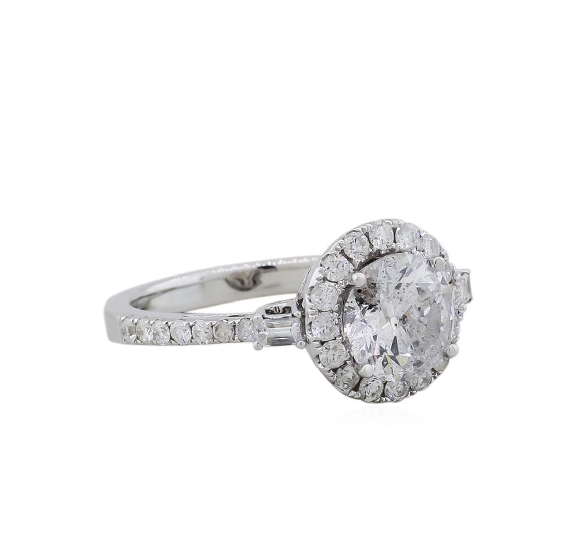 One electronically tested 14KT white gold ladies cast & assembled diamond unity ring with a bright finish. The featured diamond is set within a diamond bezel, supported by an elaborate lattice under gallery and diamond set shoulders, completed by a two millimeter wide band. Trademark is UCG. Identified with markings of "14K 585". Condition is new, good workmanship. Containing: One prong set round brilliant cut diamond, measuring 7.50 - 7.48 x 4.50mm (depth est.) approximate weight of 1.58ct with a medium blue fluorescence. Graded in the setting. Clarity: I-2. Color: GDepth 60.1%. Table 61.0%. Thirty-Two prong set round brilliant & baguette cut diamonds approximate. Total Weight of 32 Stones = 0.59ct. Graded in the setting. Clarity: SI-2 to I-1. Color: G - H. Total Weight of Diamonds 2.17ct. Total Weight of Unity Ring 3.54gm. AIG Appraised at $16,300.00.