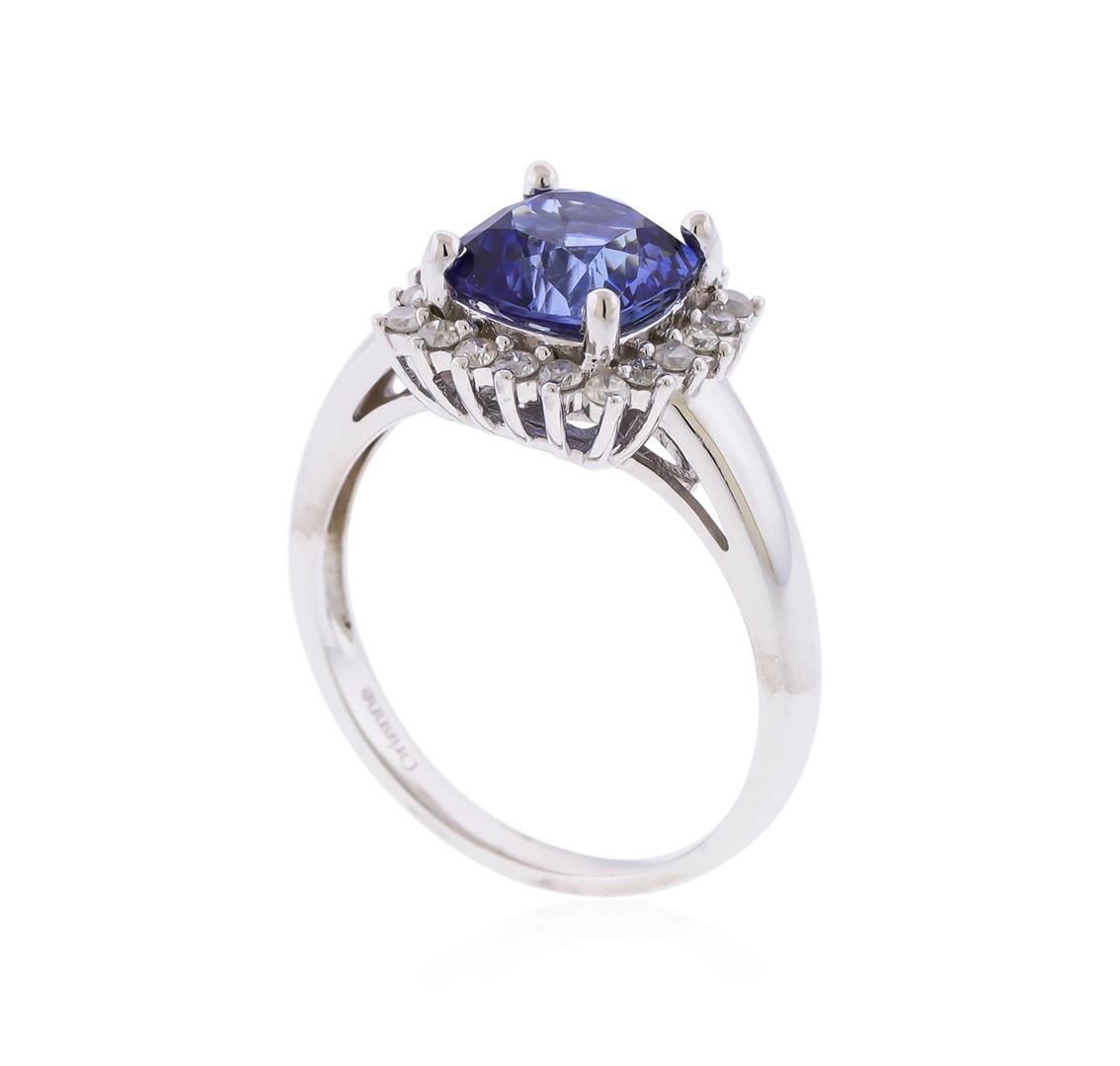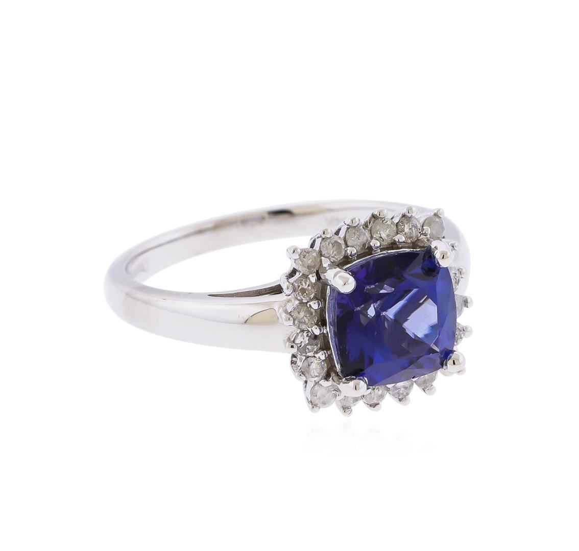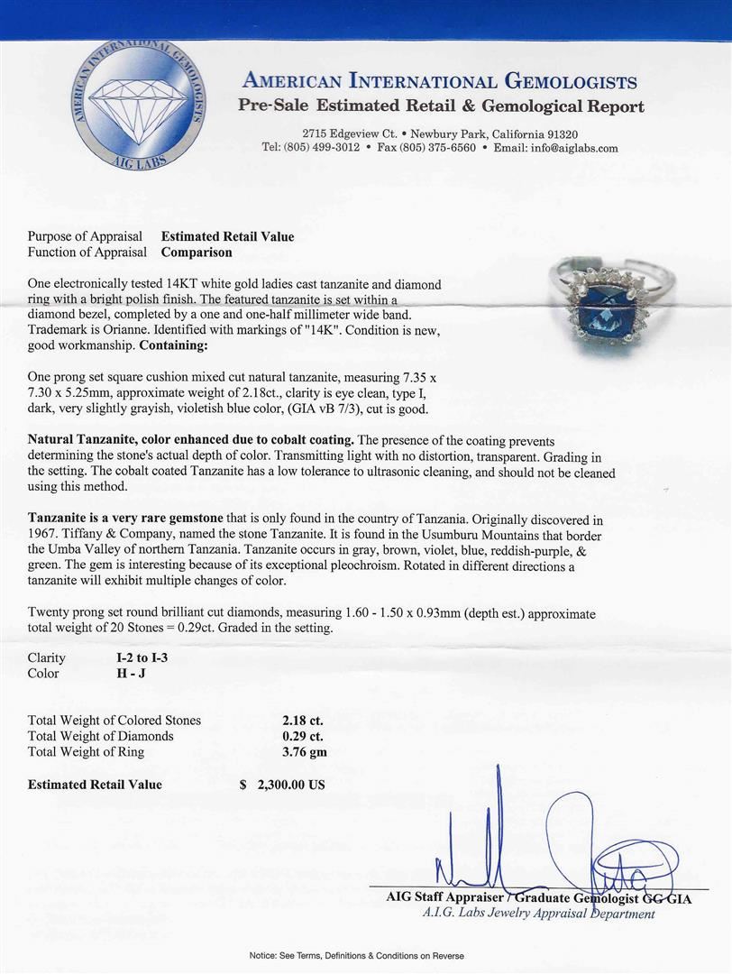 One electronically tested 14KT white gold ladies cast tanzanite and diamond ring with a bright polish finish. The featured tanzanite is set within a diamond bezel supported by diamond set shoulders, completed by a one and one-half millimeter wide band. Trademark is Orianne. Identified with markings of "14K". Condition is new, good workmanship. Containing: One prong set square cushion mixed cut natural tanzanite, measuring 7.35 x 7.30 x 5.25mm, approximate weight of 2.18ct., clarity is eye clean, type I, dark, very slightly grayish, violetish blue color, (GIA vB 7/3), cut is good. Natural Tanzanite, color enhanced due to cobalt coating. The presence of the coating prevents determining the stone's actual depth of color. Transmitting light with no distortion, transparent. Grading in the setting. The cobalt coated Tanzanite has a low tolerance to ultrasonic cleaning, and should not be cleaned using this method. Tanzanite is a very rare gemstone that is only found in the country of Tanzania. Originally discovered in 1967. Tiffany & Company, named the stone Tanzanite. It is found in the Usumburu Mountains that border the Umba Valley of northern Tanzania. Tanzanite occurs in gray, brown, violet, blue, reddish-purple, & green. The gem is interesting because of its exceptional pleochroism. Rotated in different directions a tanzanite will exhibit multiple changes of color.Twenty prong set round brilliant cut diamonds, measuring 1.60 - 1.50 x 0.93mm (depth est.) approximate total weight of 20 Stones = 0.29ct. Graded in the setting. Clarity: I-2 to I-3. Color: H - J. Total Weight of Colored Stones 2.18ct. Total Weight of Diamonds 0.29ct. AIG Appraised at $2,300.00.