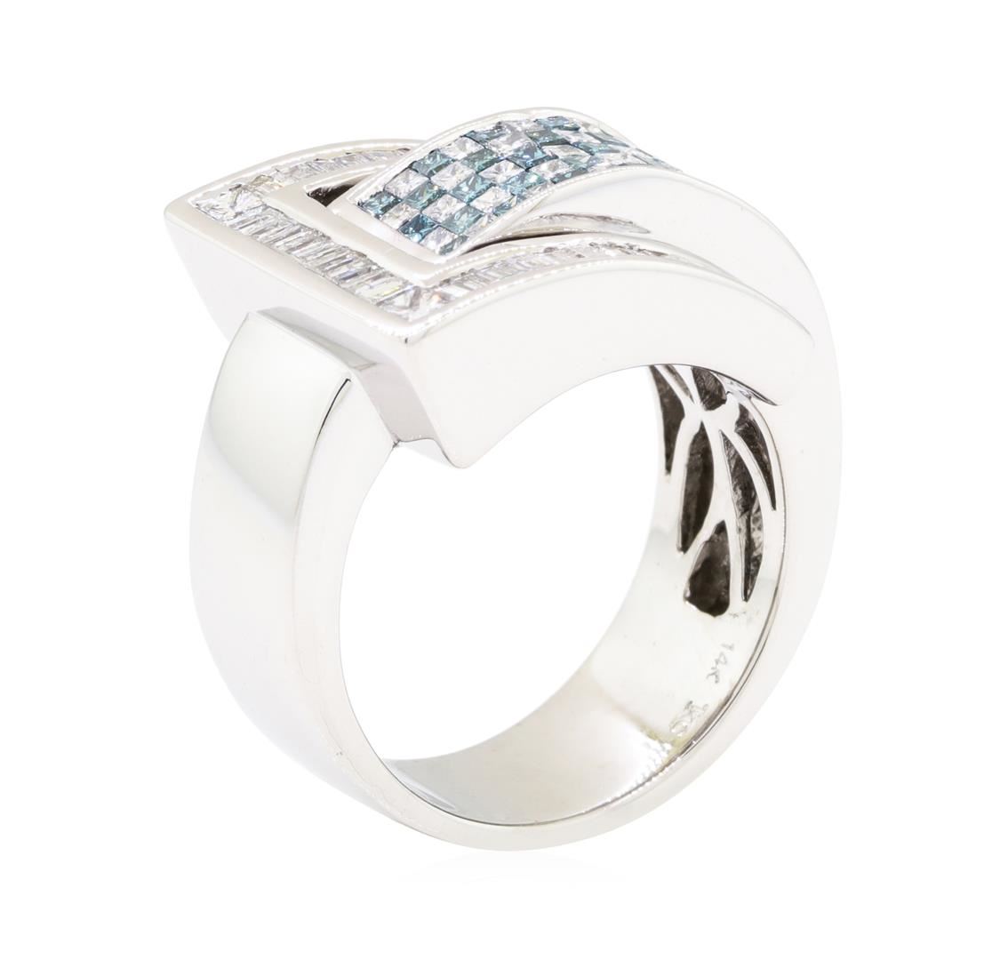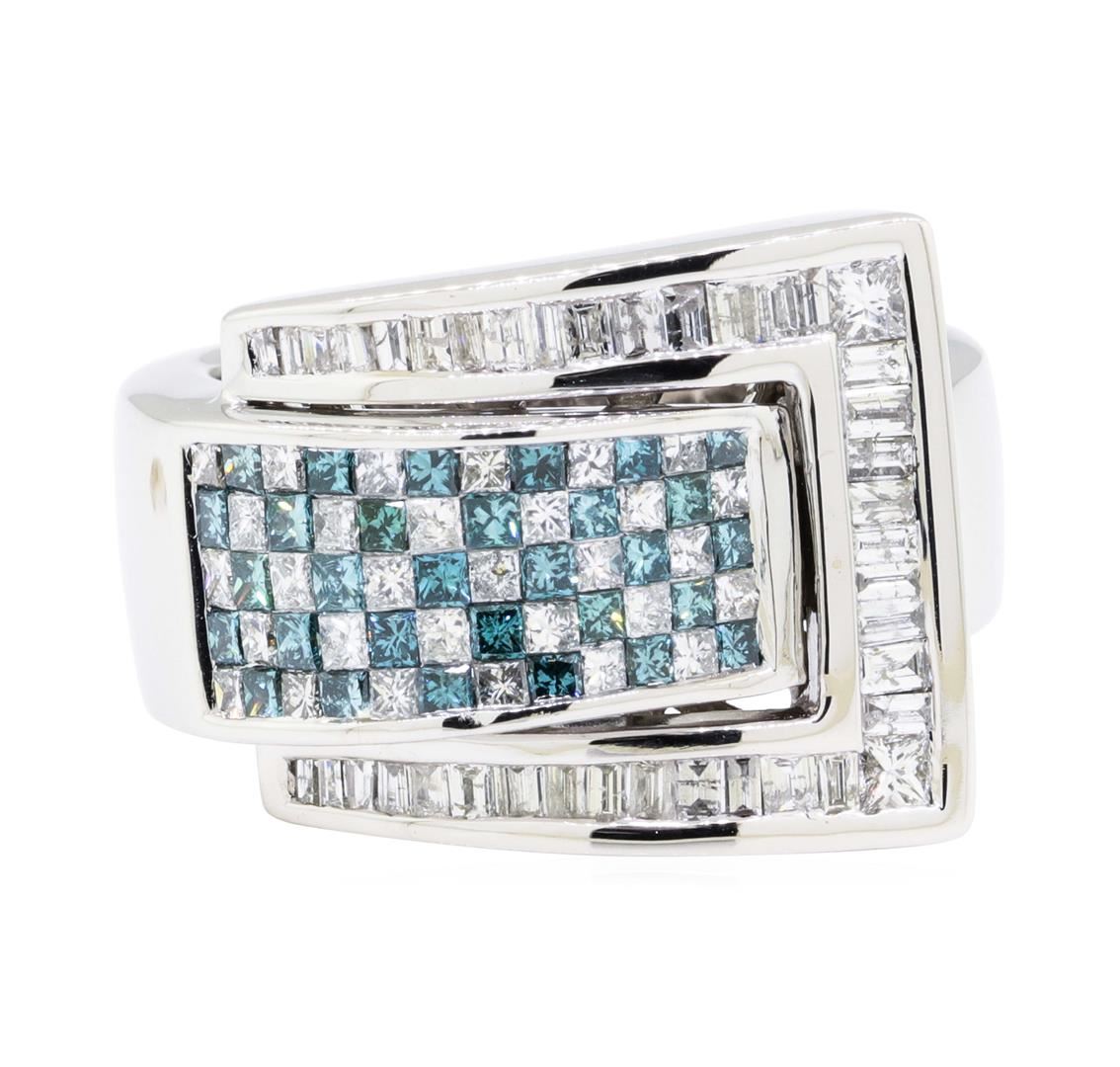 One electronically tested 14KT white gold combination cast & assembled fashion buckle ring with a bright polish finish. The featured lady's ring has a shank measuring 7.50 millimeters wide. Identified with markings of '14K'. Condition is new, good workmanship. Containing: Thirty invisible set princess cut treated diamonds, measuring 1.60 x 1.55 x 1.16mm (depth est.) approximate total weight of 30 Stones = 0.70ct. Colored gemstones are presumed to have been subjected to commonly used enhancement processes. Graded in the setting. Color Fancy Greenish Blue Clarity VS-2 to SI-1 Cut Very Good Thirty invisible set princess cut diamonds, measuring 1.60 x 1.55 x 1.16mm (depth est.) approximate total weight of 30 Stones = 0.70ct. Graded in the setting. Color H - I Clarity VS-2 to SI-2 Cut Very Good Two channel set princess cut diamonds, measuring 2.30 x 2.00 x 1.50mm (depth est.) approximate total weight of 2 Stones = 0.12ct. Graded in the setting. Color H - I Clarity VS-2 to SI-1 Cut Good Thirty-Eight channel set baguette cut diamonds, measuring from 1.50 x 1.00 x 0.85mm (depth est.) to 2.00 x 1.20 x 1.02mm (depth est.) approximate total weight of 38 Stones = 0.70ct. Graded in the setting. Color H - I Clarity SI-2 to I-1 Cut Good. Total Weight of Diamonds 2.22ct.. Total Weight of Ring 12.90gm. GAS Appraised.