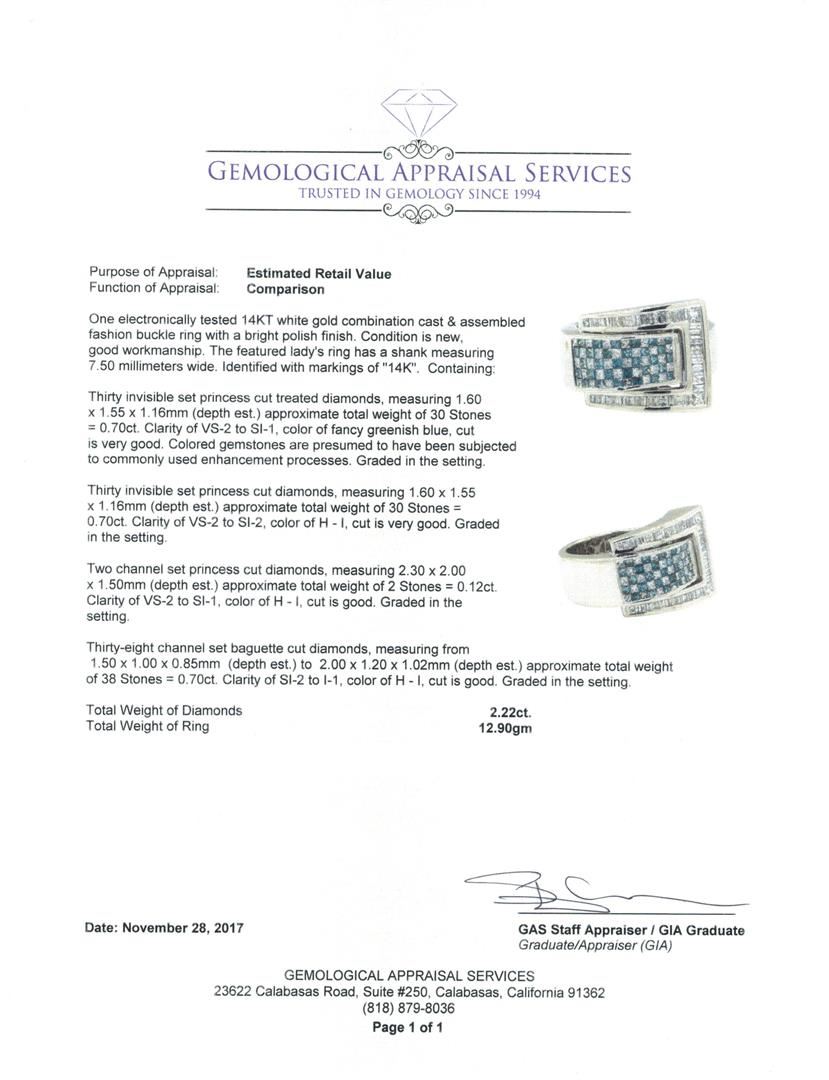 One electronically tested 14KT white gold combination cast & assembled fashion buckle ring with a bright polish finish. The featured lady's ring has a shank measuring 7.50 millimeters wide. Identified with markings of '14K'. Condition is new, good workmanship. Containing: Thirty invisible set princess cut treated diamonds, measuring 1.60 x 1.55 x 1.16mm (depth est.) approximate total weight of 30 Stones = 0.70ct. Colored gemstones are presumed to have been subjected to commonly used enhancement processes. Graded in the setting. Color Fancy Greenish Blue Clarity VS-2 to SI-1 Cut Very Good Thirty invisible set princess cut diamonds, measuring 1.60 x 1.55 x 1.16mm (depth est.) approximate total weight of 30 Stones = 0.70ct. Graded in the setting. Color H - I Clarity VS-2 to SI-2 Cut Very Good Two channel set princess cut diamonds, measuring 2.30 x 2.00 x 1.50mm (depth est.) approximate total weight of 2 Stones = 0.12ct. Graded in the setting. Color H - I Clarity VS-2 to SI-1 Cut Good Thirty-Eight channel set baguette cut diamonds, measuring from 1.50 x 1.00 x 0.85mm (depth est.) to 2.00 x 1.20 x 1.02mm (depth est.) approximate total weight of 38 Stones = 0.70ct. Graded in the setting. Color H - I Clarity SI-2 to I-1 Cut Good. Total Weight of Diamonds 2.22ct.. Total Weight of Ring 12.90gm. GAS Appraised.