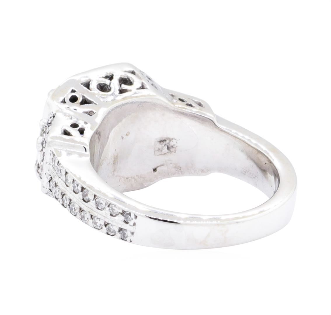One electronically tested 14KT white gold lady's cast fashion ring with a square cushion halo with a bright polish finish. The featured lady's ring has a shank measuring 2.63 millimeters wide. Identified with markings of '14K'. Condition is new, good workmanship. Containing: One prong set round modified mixed cut natural blue sapphire, measuring 6.72 - 6.65 x 4.35 mm, (depth est.) approximate weight of 1.57ct., clarity is slightly included, medium dark, strong, blue color, (GIA B 6/5), cut is very good. Transmitting light with a minimum of distortion, transparent. Colored gemstones are presumed to have been subjected to commonly used enhancement processes. Graded in the setting. Two prong set step trapezoid cut diamonds, measuring 3.10 x 2.20 x 1.32mm (depth est.) approximate total weight of 2 Stones = 0.25ct. Graded in the setting. Color H - I Clarity SI-1 to SI-2 Cut Good Sixty-Eight prong set round brilliant cut diamonds, measuring 1.30 - 1.00 x 0.71mm (depth est.) approximate total weight of 68 Stones = 0.40ct. Graded in the setting. Color H - I Clarity SI-1 to SI-2 Cut Good. Total Weight of Colored Stones 1.57ct. Total Weight of Diamonds 0.65ct. Total Weight of Ring 6.80gm. GAS Appraised.