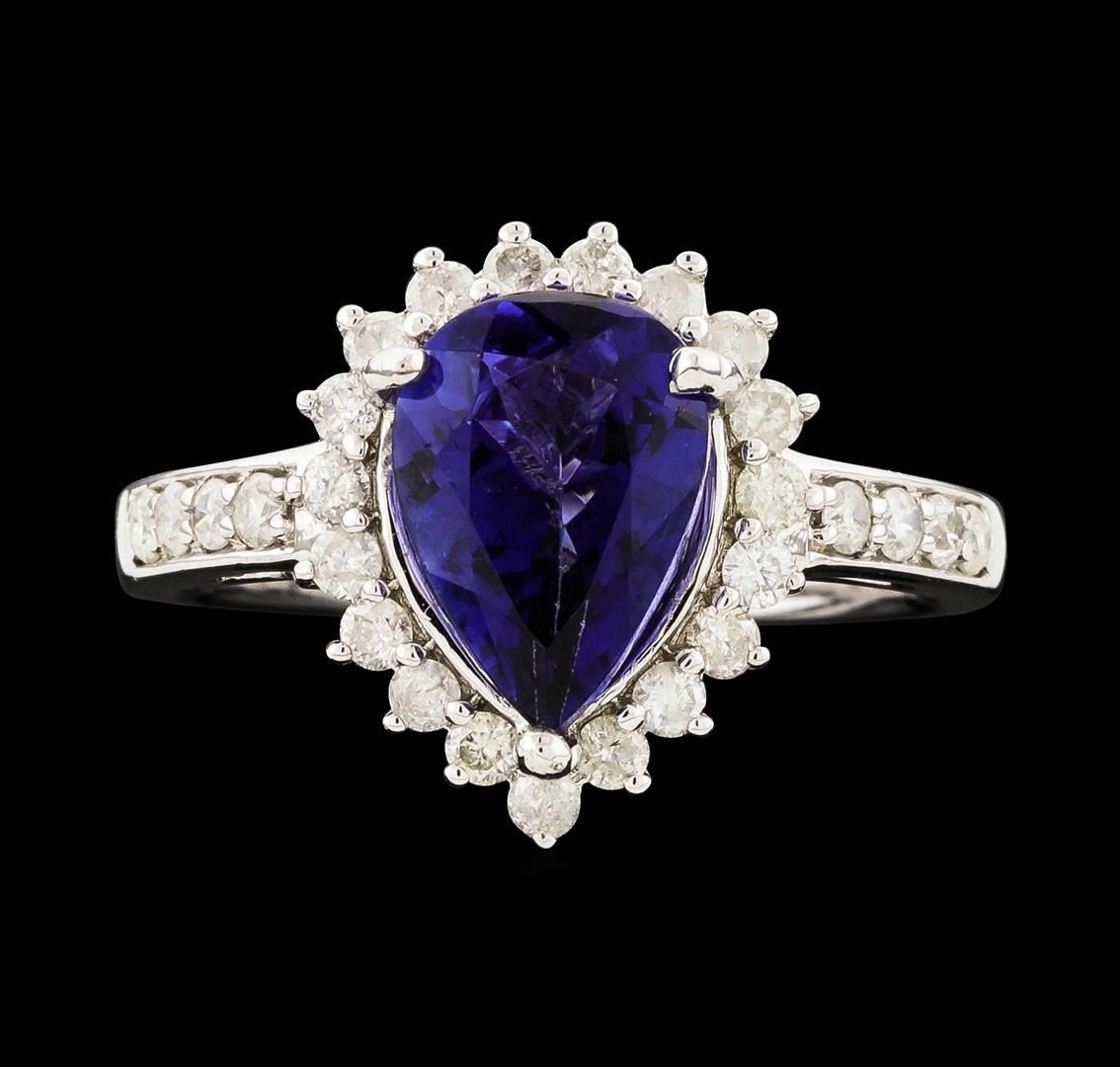 One electronically tested 14KT white gold ladies cast tanzanite & diamond ring with a bright finish. The featured tanzanite is set within a diamond bezel, supported by a ribbed under gallery, and an elaborate lattice, and diamond set shoulders, completed by a two millimeter wide band. Trademark is Orianne. Identified with markings of "14K". Condition is new, good workmanship. Containing: One prong set pear brilliant cut natural tanzanite, measuring 10.20 x 7.00 x 4.70mm, stated weight of 2.25ct., clarity is eye clean, type I, dark, moderately strong, blue color, (GIA B 7/4), cut is good. Natural Tanzanite, color enhanced due to cobalt coating. The presence of the coating prevents determining the stone's actual depth of color. Transmitting light with no distortion, transparent. Grading in the setting. The cobalt coated Tanzanite has a low tolerance to ultrasonic cleaning, and should not be cleaned using this method. Tanzanite is a very rare gemstone that is only found in the country of Tanzania. Originally discovered in 1967. Tiffany & Company, named the stone Tanzanite. It is found in the Usumburu Mountains that border the Umba Valley of northern Tanzania. Tanzanite occurs in gray, brown, violet, blue, reddish-purple, & green. The gem is interesting because of its exceptional pleochroism. Rotated in different directions a tanzanite will exhibit multiple changes of color. Twenty-Seven prong set round brilliant cut diamonds (depth est.) approximate total weight of 27 Stones = 0.54ct. Graded in the setting. Clarity: I-1 to I-3. Color: F - H. Total Weight of Colored Stones 2.25ct. Total Weight of Diamonds 0.54ct. Total Weight of Ring 3.72gm. AIG Appraised.