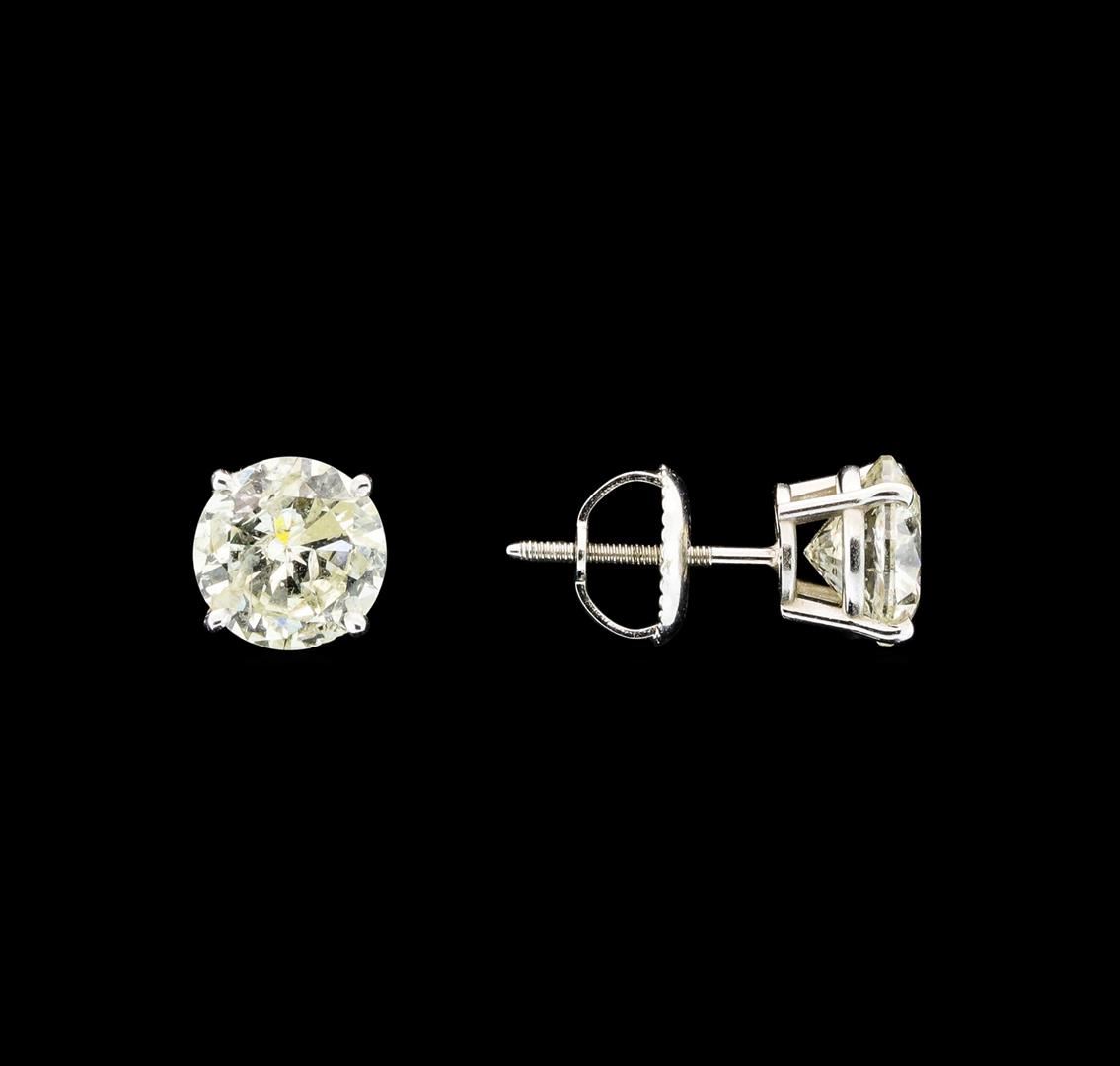 One electronically tested 14KT white gold cast & assembled diamond solitaire earrings with screw backs. Identified with markings of "14K". Condition is new, good workmanship. Containing: One prong set round brilliant cut diamond, measuring 6.90 - 6.80 x 3.80mm (depth est.), 2.00.%. GTCF approximate weight of 1.10ct with a strong blue fluorescence. Graded in the setting. Clarity: I-2. Color: MDepth 55.5%. Table 67.2%. One prong set round brilliant cut diamond, measuring 6.70 - 6.70 x 4.00mm (depth est.), 7.00.%. GTCF approximate weight of 1.16ct with a strong blue fluorescence. Graded in the setting. Clarity: I-2. Color: MDepth 59.7%. Table 67.2%. Total Weight of Diamonds 2.26ct. Total Weight of Earrings 1.29gm. AIG Appraised.