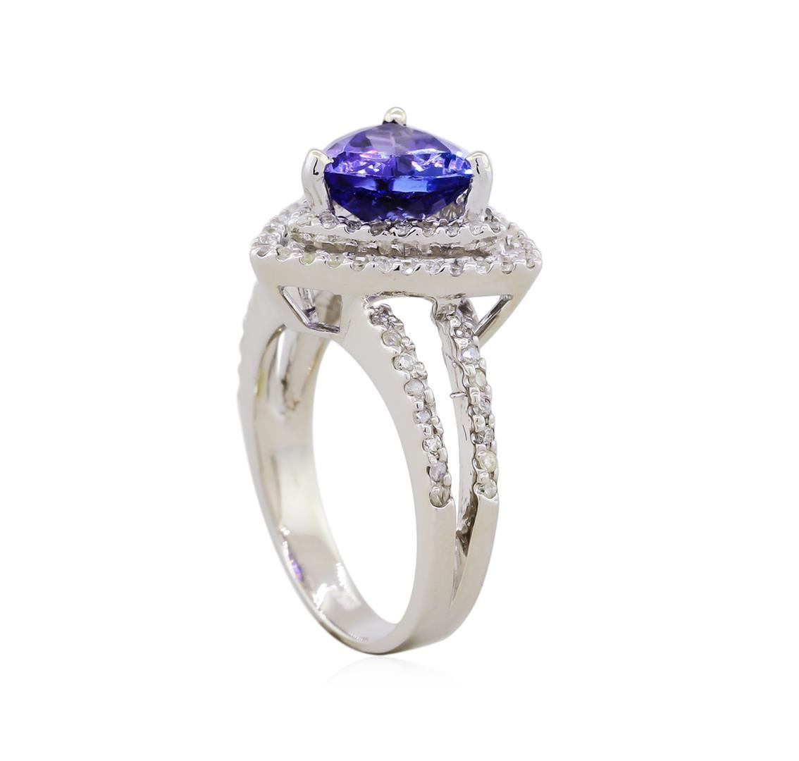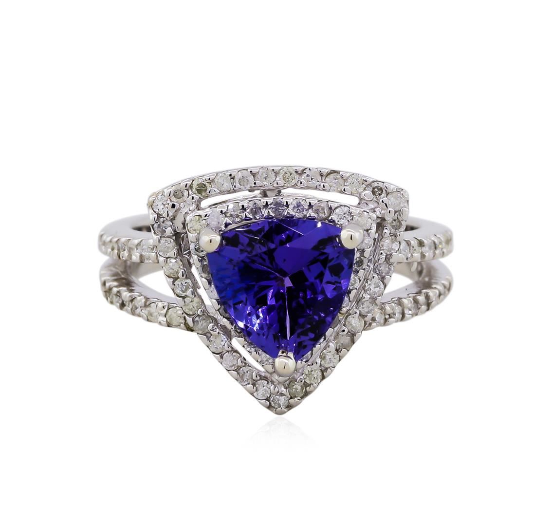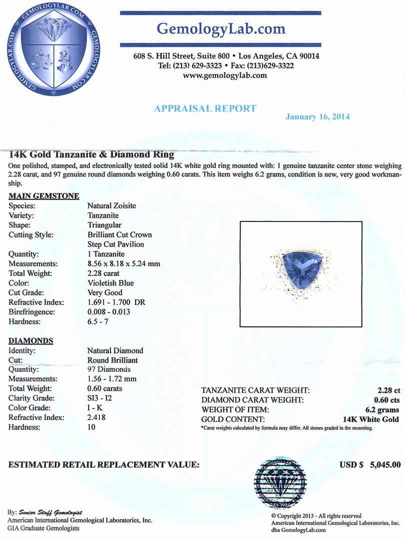 One polished, stamped and tested 14KT white gold ring mounted with: 1 genuine tanzanite center stone weighing 2.28 carats, and 97 genuine round diamonds weighing 0.60 carats. The centerstone measures 8.56 x 8.18 x 5.24mm, color is violetish blue, featuring brilliant cut crown,step cut pavillion. Adjacent diamonds clarity is SI3-I2. This item weighs 6.2 grams, condition is new and workmanship is excellent. Gemology Lab Appraised at $5,045.00.