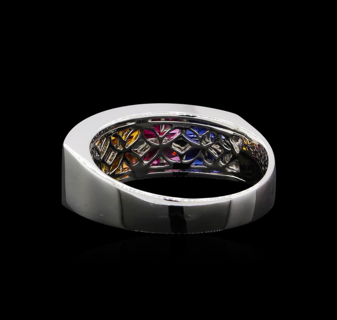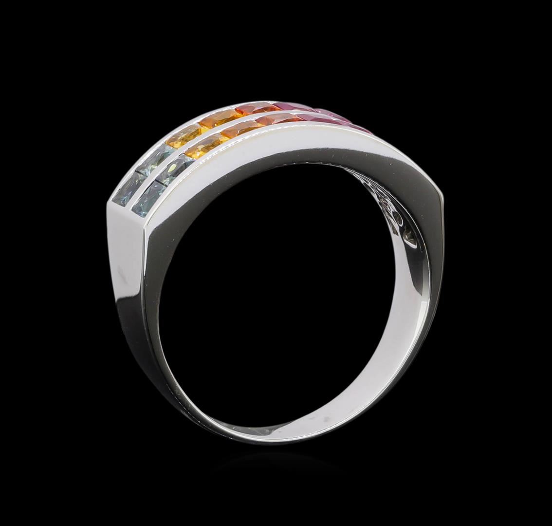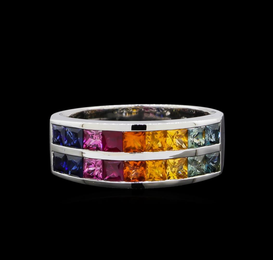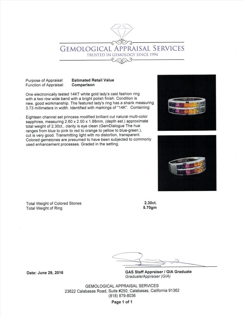 One electronically tested 14KT white gold lady's cast fashion ring with a two row wide band with a bright polish finish. The featured lady's ring has a shank measuring 3.73 millimeters in width. Identified with markings of "14K". Condition is new, good workmanship. Containing: Eighteen channel set princess modified brilliant cut natural multi-color sapphires, measuring 2.60 x 2.50 x 1.88mm, (depth est.) approximate total weight of 2.30ct., clarity is eye clean (GemDialogue The hue ranges from blue to pink to red to orange to yellow to blue-green.), cut is very good. Transmitting light with no distortion, transparent. Colored gemstones are presumed to have been subjected to commonly used enhancement processes. Graded in the setting.Total Weight of Colored Stones 2.30ct. Total Weight of Ring 5.70gm. GAS Appraised.