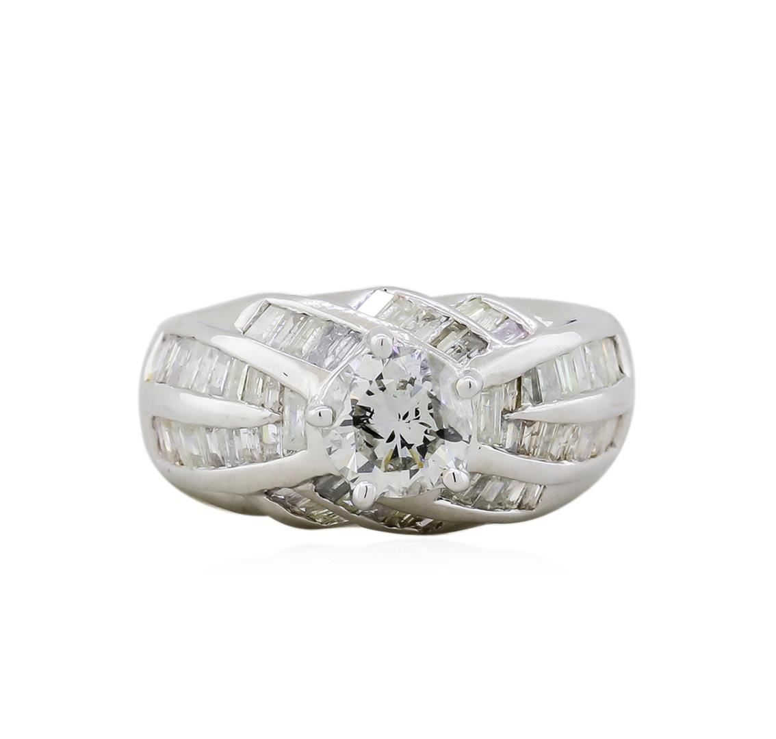 One electronically tested 18KT white gold ladies cast & assembled diamond unity ring with a bright finish. The featured diamond is set within a curvature of diamond ribbons, supported by tapering shoulders, completed by a three millimeter wide band. Identified with markings of "18K". Condition is new, good workmanship. Containing: One prong set round brilliant cut diamond, measuring 6.40 - 6.30 x 3.91mm (depth est.), 4.00.%. GTCF approximate weight of 1.01ct with a strong blue fluorescence. Graded in the setting. Clarity: I-1. Color: HDepth 61.6%. Table 64.6%. Sixty-Four channel set baguette cut (tapered) diamonds approximate. Total Weight of 64 Stones = 1.29ct. Graded in the setting. Clarity: I-1 to I-3. Color: I - K. Total Weight of Diamonds 2.30ct. AIG Appraised at $16,100.00.