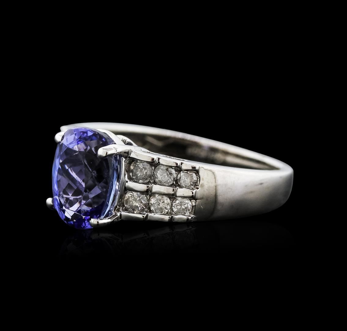 One electronically tested 14KT white gold ladies cast tanzanite and diamond ring with a tapered shank with a bright polish finish. Trademark is Orianne. Identified with markings of "14K". Condition is new. Containing: One prong set oval modified brilliant cut natural tanzanite, measuring 8.89 x 6.92 x 5.37mm, approximate weight of 2.32ct., clarity is eye clean, type I, medium light, very slightly grayish, violet color, (GIA V 4/3), cut is good. Twelve channel set round brilliant cut diamonds, measuring 2.00 - 2.00 x 1.20mm (depth est.) approximate total weight of 12 Stones = 0.35ct. Clarity: I-1 to I-2. Color: I - J. All diamonds and colored gemstones are graded in the mounting, unless otherwise stated. Colored gemstones are presumed to have been subjected to commonly used enhancement processes. Total Weight of Colored Stones 2.32ct. Total Weight of Diamonds 0.35ct. Total Weight of Ring 4.30 grams. GGL Appraised.