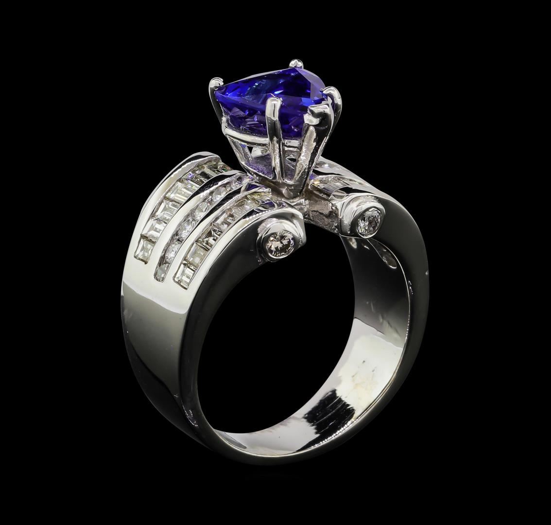 One electronically tested 14KT white gold lady's combination cast & assembled fashion ring with a three row wide band with a bright polish finish. The featured lady's ring has a shank measuring 5.70 millimeters wide. Identified with markings of "14K". Condition is new, good workmanship. Containing: One prong set triangle modified brilliant cut natural tanzanite, measuring 9.50 x 7.70 x 4.90mm, (depth est.) 10%. bulge factor, approximate weight of 2.40ct., clarity is eye clean, medium dark, strong, violetish blue color, (GIA vB 6/5), cut is good. Transmitting light with no distortion, transparent. Colored gemstones are presumed to have been subjected to commonly used enhancement processes. Graded in the setting. Four bezel set round brilliant cut diamonds, measuring 2.40 - 2.35 x 1.48mm (depth est.) approximate total weight of 4 Stones = 0.20ct. Graded in the setting. Clarity: SI-1 to SI-2. Color: H - ICut Good Twelve channel set round brilliant cut diamonds, measuring 1.90 - 1.80 x 1.15mm (depth est.) approximate total weight of 12 Stones = 0.30ct. Graded in the setting. Clarity: SI-1 to I-1. Color: H - ICut Good Twenty-Four channel set baguette cut diamonds, measuring from 2.40 x 1.55 x 1.32mm (depth est.) to 2.80 x 1.70 x 1.45mm (depth est.) approximate total weight of 24 Stones = 1.30ct. Graded in the setting. Clarity: VS-1 to VS-2. Color: H - ICut Very Good. Total Weight of Colored Stones 2.40ct. Total Weight of Diamonds 1.80ct. Total Weight of Ring 13.30gm. GAS Appraised.
