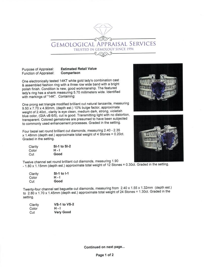 One electronically tested 14KT white gold lady's combination cast & assembled fashion ring with a three row wide band with a bright polish finish. The featured lady's ring has a shank measuring 5.70 millimeters wide. Identified with markings of "14K". Condition is new, good workmanship. Containing: One prong set triangle modified brilliant cut natural tanzanite, measuring 9.50 x 7.70 x 4.90mm, (depth est.) 10%. bulge factor, approximate weight of 2.40ct., clarity is eye clean, medium dark, strong, violetish blue color, (GIA vB 6/5), cut is good. Transmitting light with no distortion, transparent. Colored gemstones are presumed to have been subjected to commonly used enhancement processes. Graded in the setting. Four bezel set round brilliant cut diamonds, measuring 2.40 - 2.35 x 1.48mm (depth est.) approximate total weight of 4 Stones = 0.20ct. Graded in the setting. Clarity: SI-1 to SI-2. Color: H - ICut Good Twelve channel set round brilliant cut diamonds, measuring 1.90 - 1.80 x 1.15mm (depth est.) approximate total weight of 12 Stones = 0.30ct. Graded in the setting. Clarity: SI-1 to I-1. Color: H - ICut Good Twenty-Four channel set baguette cut diamonds, measuring from 2.40 x 1.55 x 1.32mm (depth est.) to 2.80 x 1.70 x 1.45mm (depth est.) approximate total weight of 24 Stones = 1.30ct. Graded in the setting. Clarity: VS-1 to VS-2. Color: H - ICut Very Good. Total Weight of Colored Stones 2.40ct. Total Weight of Diamonds 1.80ct. Total Weight of Ring 13.30gm. GAS Appraised.