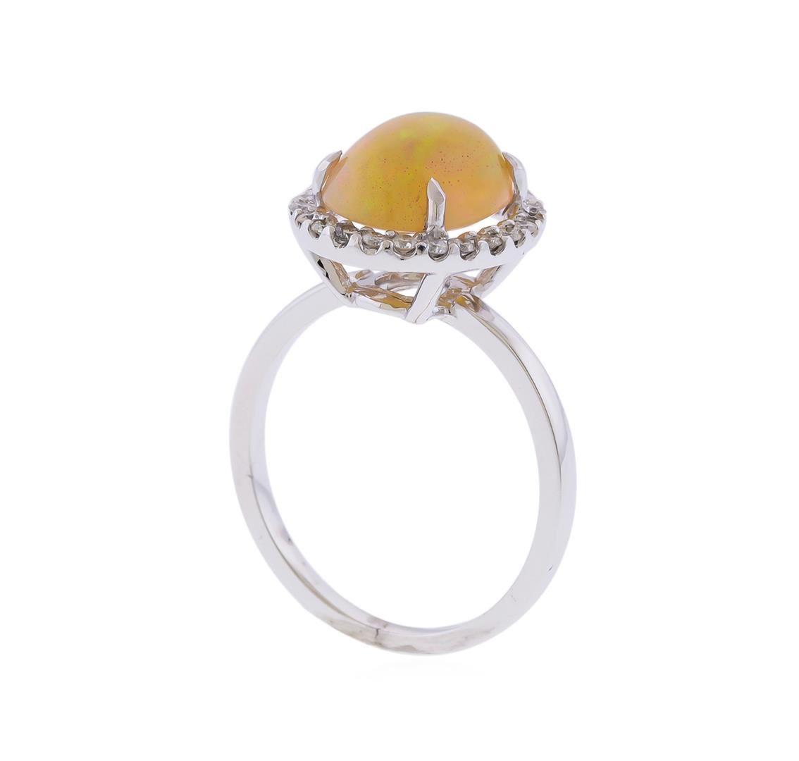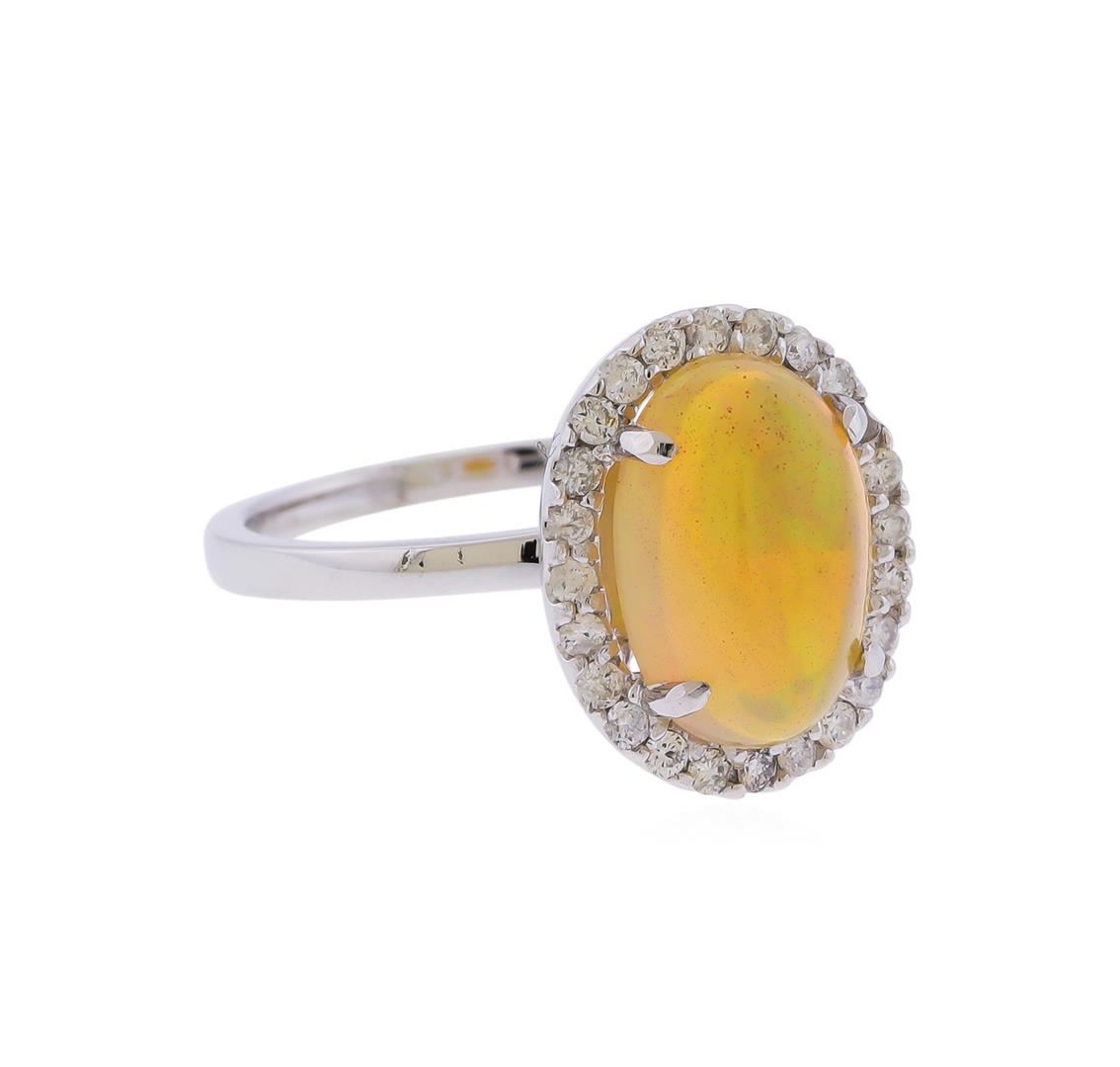Containing 14K White Gold Ring weighing approximately 3.60 grams. (1) Oval Shaped Cabochon opal weighing approximately 2.44cts; Surrounded by diamonds weighing approximately 0.28ctw, Clarity: SI Clarity, Color: G-H. RBGS Appraised at $1,200.00.
