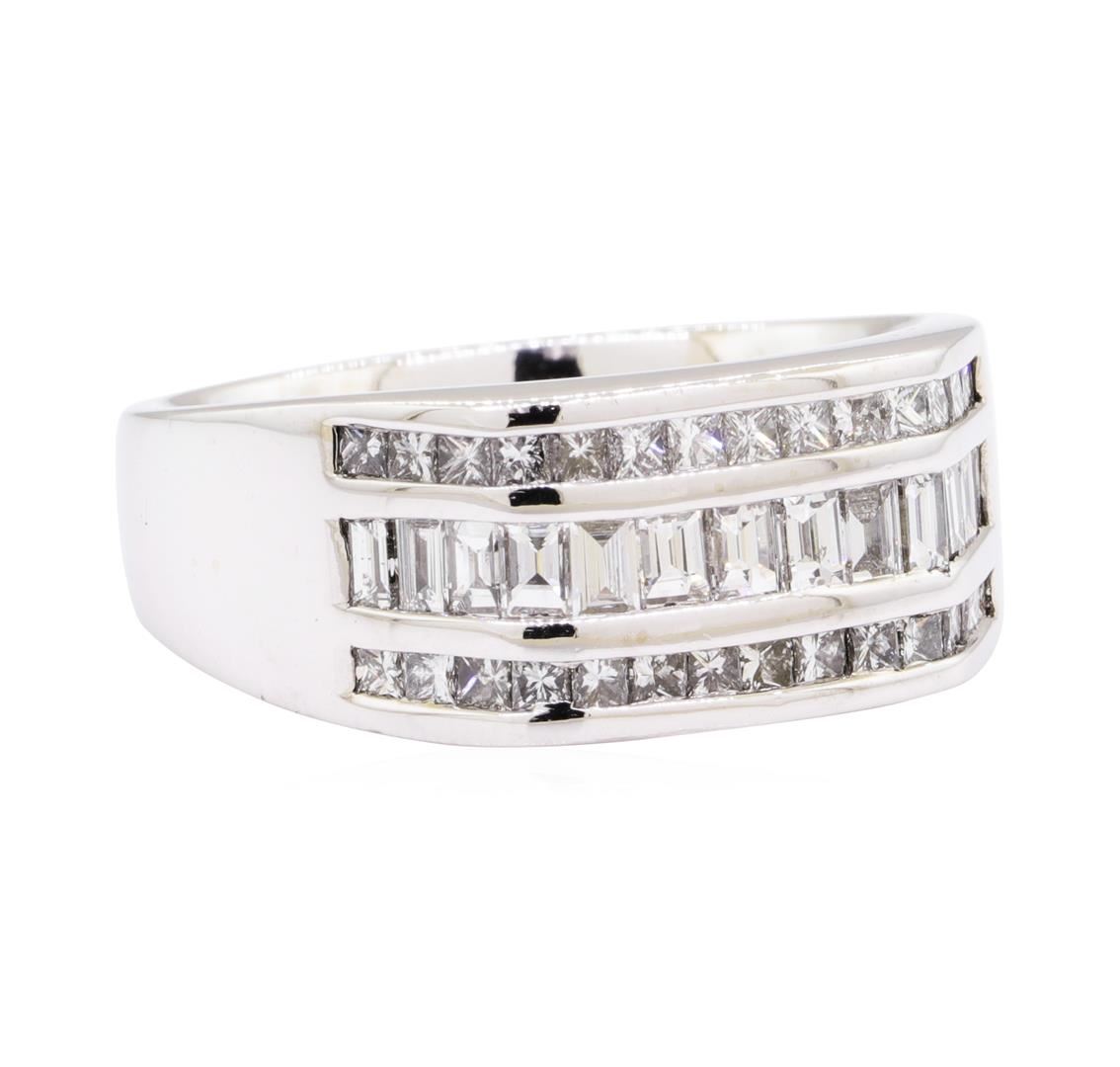 One electronically tested 14KT white gold man's cast fashion ring with a straight line channel with a bright polish finish. The featured man's ring has a shank measuring 4.90 millimeters wide. Identified with markings of '14K'. Condition is new, good workmanship. Containing: Thirteen channel set baguette cut diamonds, measuring from 3.10 x 1.80 x 1.53mm (depth est.) to 3.20 x 2.40 x 2.04mm (depth est.) approximate total weight of 13 Stones = 1.40ct. Graded in the setting. Color H - I, Clarity VS-1 to SI-1, Cut Good Twenty-Eight channel set princess cut diamonds, measuring 1.90 x 1.80 x 1.35mm (depth est.) approximate total weight of 28 Stones = 1.05ct. Graded in the setting. Color H - I, Clarity VS-1 to SI-1, Cut Good. Total Weight of Diamonds 2.45ct. Total Weight of Ring 15.90gm. GAS Appraised.