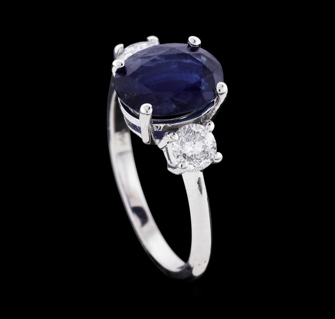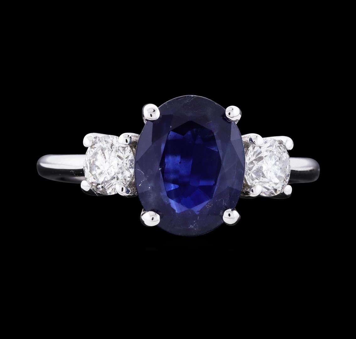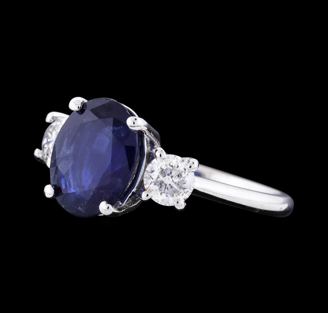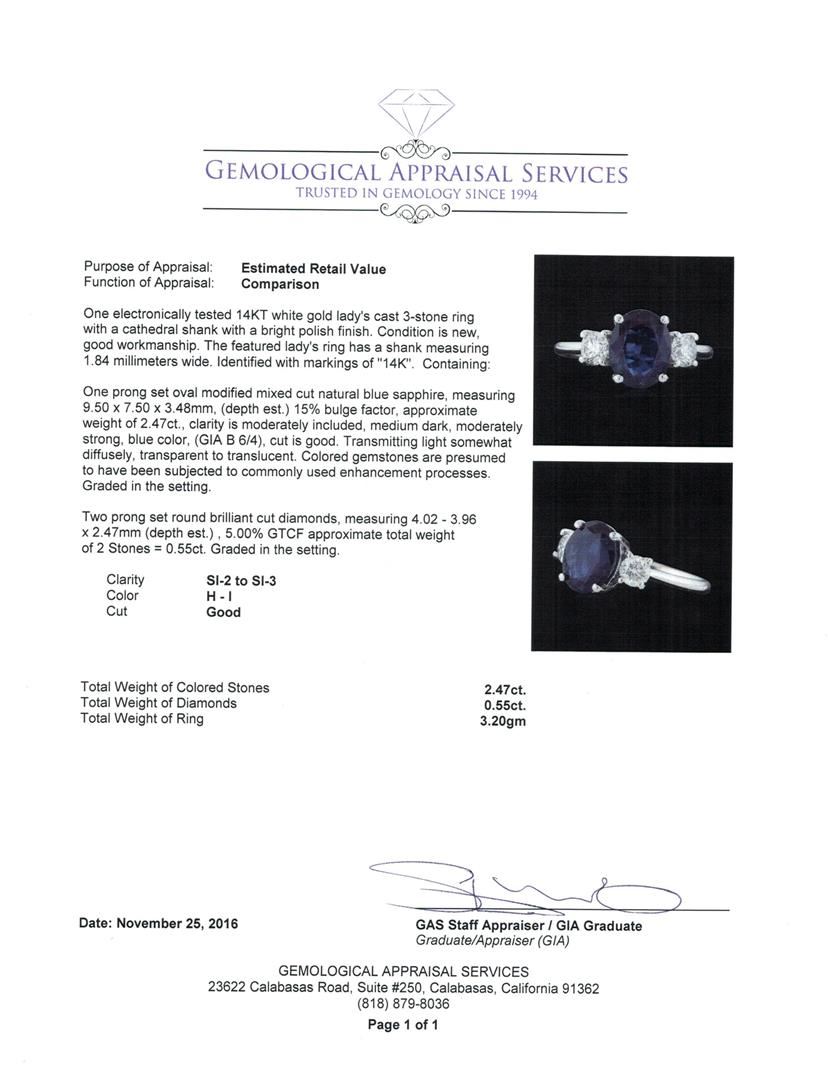 One electronically tested 14KT white gold lady's cast 3-stone ring with a cathedral shank with a bright polish finish. The featured lady's ring has a shank measuring 1.84 millimeters wide. Identified with markings of "14K". Condition is new, good workmanship. Containing: One prong set oval modified mixed cut natural blue sapphire, measuring 9.50 x 7.50 x 3.48mm, (depth est.) 15%. bulge factor, approximate weight of 2.47ct., clarity is moderately included, medium dark, moderately strong, blue color, (GIA B 6/4), cut is good. Transmitting light somewhat diffusely, transparent to translucent. Colored gemstones are presumed to have been subjected to commonly used enhancement processes. Graded in the setting. Two prong set round brilliant cut diamonds, measuring 4.02 - 3.96 x 2.47mm (depth est.) , 5.00.%. GTCF approximate total weight of 2 Stones = 0.55ct. Graded in the setting. Clarity: SI-2 to SI-3. Color: H - ICut Good. Total Weight of Colored Stones 2.47ct. Total Weight of Diamonds 0.55ct. Total Weight of Ring 3.20gm. GAS Appraised.