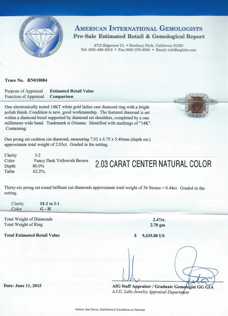 One electronically tested 14KT white gold ladies cast diamond ring with a bright polish finish. The featured diamond is set within a diamond bezel supported by diamond set shoulders, completed by a one millimeter wide band. Trademark is Orianne. Identified with markings of "14K". Condition is new, good workmanship. Containing: One prong set cushion cut diamond, measuring 7.02 x 6.75 x 5.40mm (depth est.) approximate. Total Weight of 2.03ct. Graded in the setting. Clarity: I-2. Color: Fancy Dark Yellowish BrownDepth 80.0%. Table 62.2%. Thirty-Six prong set round brilliant cut diamonds approximate. Total Weight of 36 Stones = 0.44ct. Graded in the setting. Clarity: SI-2 to I-1. Color: G - H. Total Weight of Diamonds 2.47ct. AIG Appraised at $9,435.00.