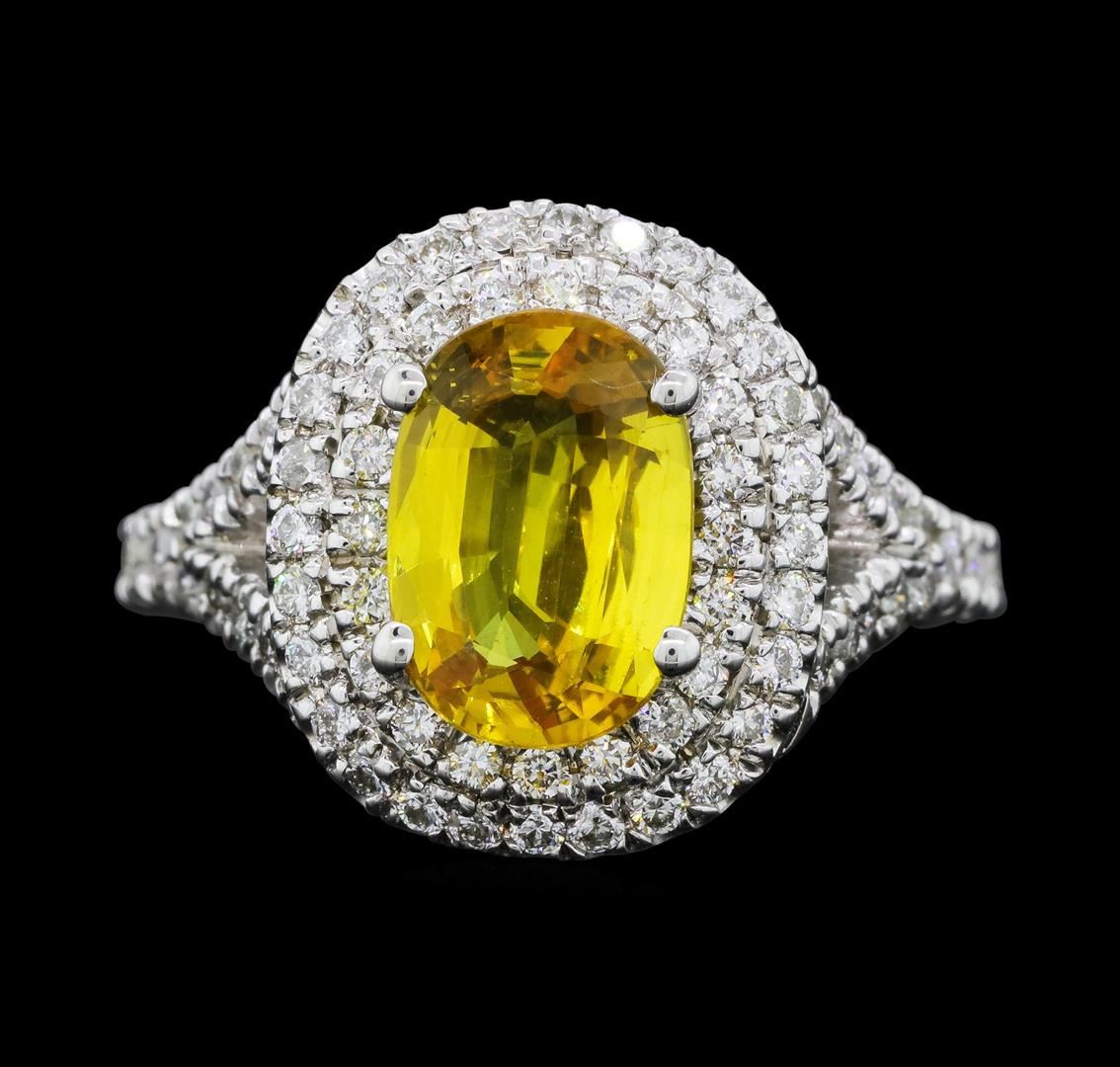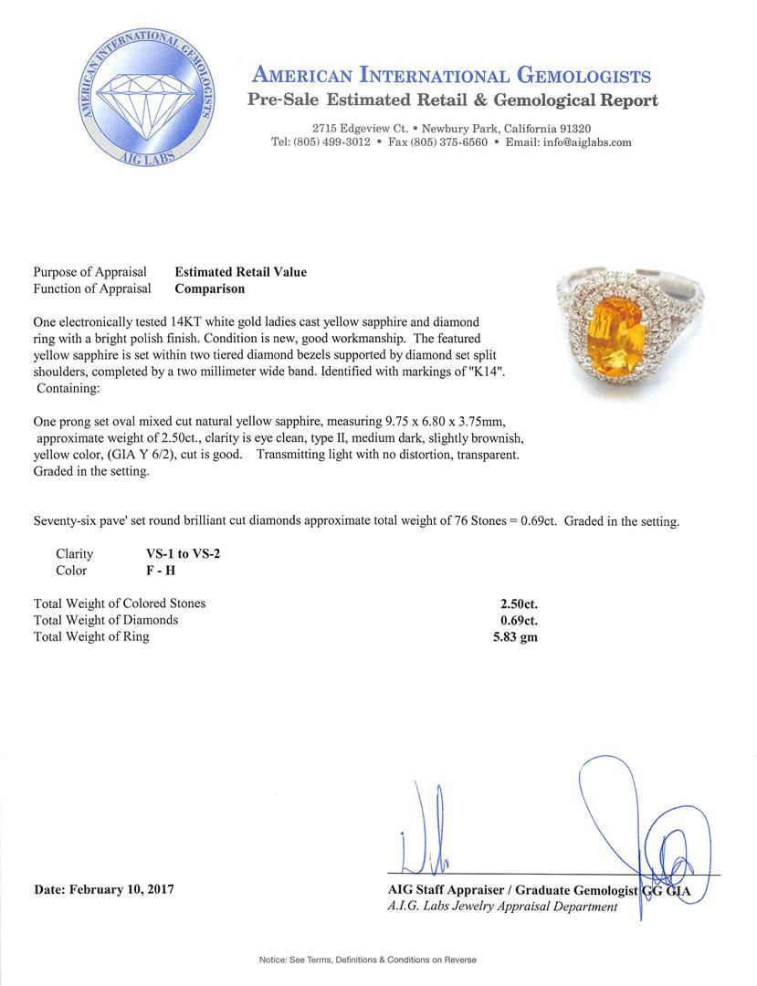 One electronically tested 14KT white gold ladies cast yellow sapphire and diamond ring with a bright polish finish. The featured yellow sapphire is set within two tiered diamond bezels supported by diamond set split shoulders, completed by a two millimeter wide band. Identified with markings of "K14". Condition is new, good workmanship. Containing: One prong set oval mixed cut natural yellow sapphire, measuring 9.75 x 6.80 x 3.75mm, approximate weight of 2.50ct., clarity is eye clean, type II, medium dark, slightly brownish, yellow color, (GIA Y 6/2), cut is good. Transmitting light with no distortion, transparent. Graded in the setting. Seventy-Six pave' set round brilliant cut diamonds approximate total weight of 76 Stones = 0.69ct. Graded in the setting. Clarity: VS-1 to VS-2. Color: F - H. Total Weight of Colored Stones 2.50ct. Total Weight of Diamonds 0.69ct. Total Weight of Ring 5.83gm. AIG Appraised.