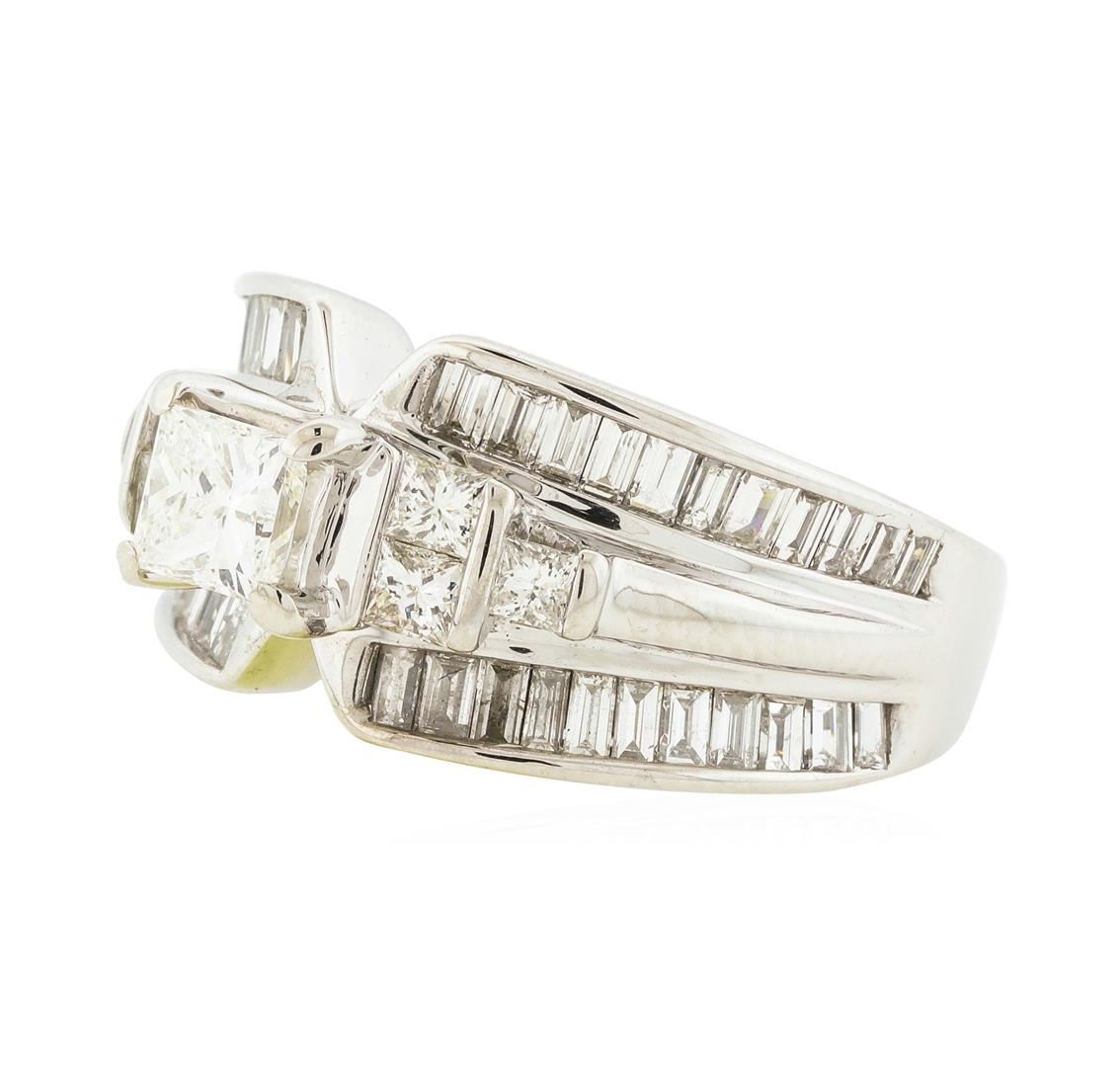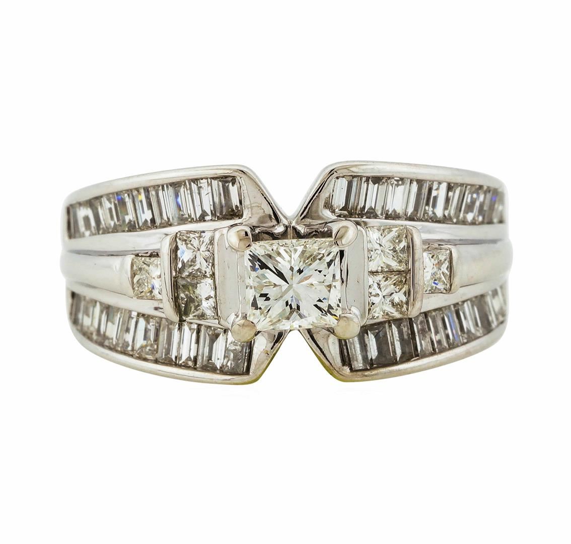 One 14KT White Gold 2.50ctw Diamond Ring with a total weight of 8.8 grams. Center diamond has a weight of 2.05cts with a color of (G-H) and clarity of (SI-1). Side diamonds have a total weight of 0.45cts with a color of (G-H) and clarity of (VS2-SI-1). GGA Appraised.