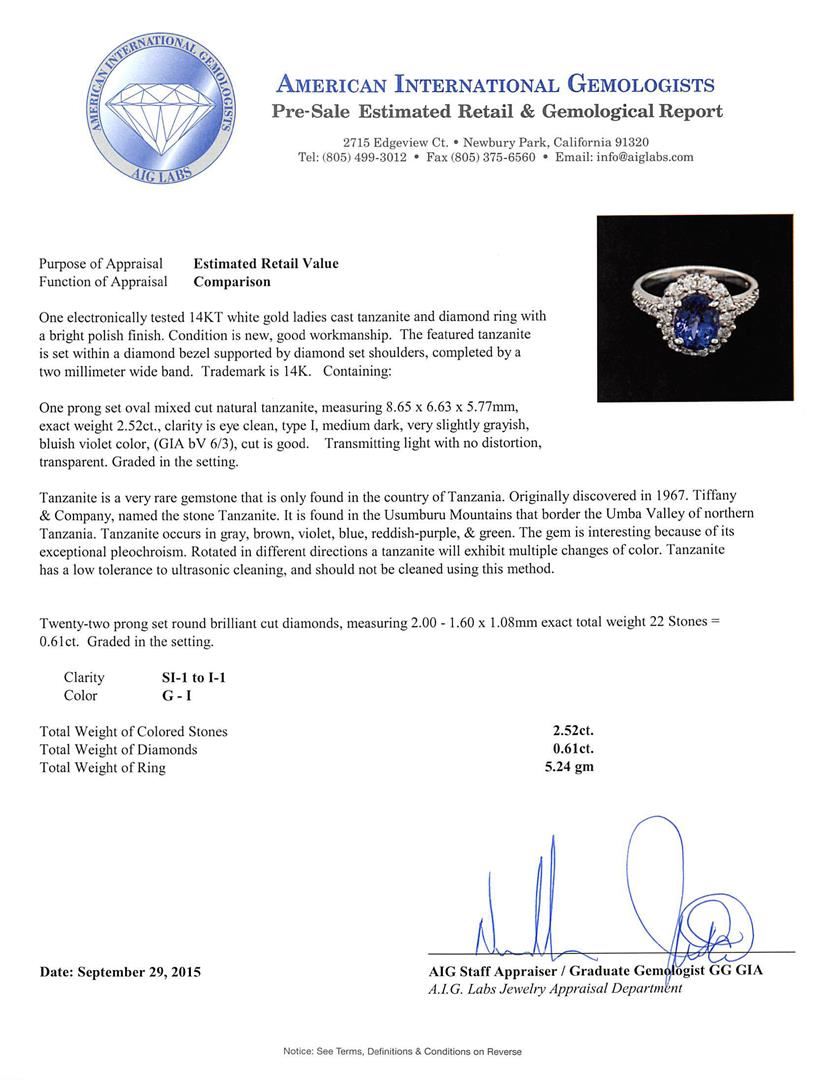 One electronically tested 14KT white gold ladies cast tanzanite and diamond ring with a bright polish finish. The featured tanzanite is set within a diamond bezel supported by diamond set shoulders, completed by a two millimeter wide band. Trademark is 14K. Condition is new, good workmanship. Containing: One prong set oval mixed cut natural tanzanite, measuring 8.65 x 6.63 x 5.77mm, exact weight 2.52ct., clarity is eye clean, type I, medium dark, very slightly grayish, bluish violet color, (GIA bV 6/3), cut is good. Transmitting light with no distortion, transparent. Graded in the setting. Tanzanite is a very rare gemstone that is only found in the country of Tanzania. Originally discovered in 1967. Tiffany & Company, named the stone Tanzanite. It is found in the Usumburu Mountains that border the Umba Valley of northern Tanzania. Tanzanite occurs in gray, brown, violet, blue, reddish-purple, & green. The gem is interesting because of its exceptional pleochroism. Rotated in different directions a tanzanite will exhibit multiple changes of color. Tanzanite has a low tolerance to ultrasonic cleaning, and should not be cleaned using this method. Twenty-Two prong set round brilliant cut diamonds, measuring 2.00 - 1.60 x 1.08mm exact total weight 22 Stones = 0.61ct. Graded in the setting. Clarity: SI-1 to I-1. Color: G - I. Total Weight of Colored Stones 2.52ct. Total Weight of Diamonds 0.61ct. Total Weight of Ring 5.24gm. AIG Appraised.