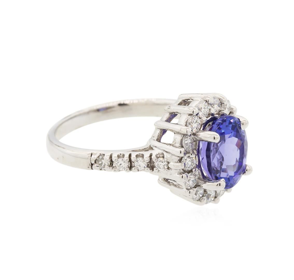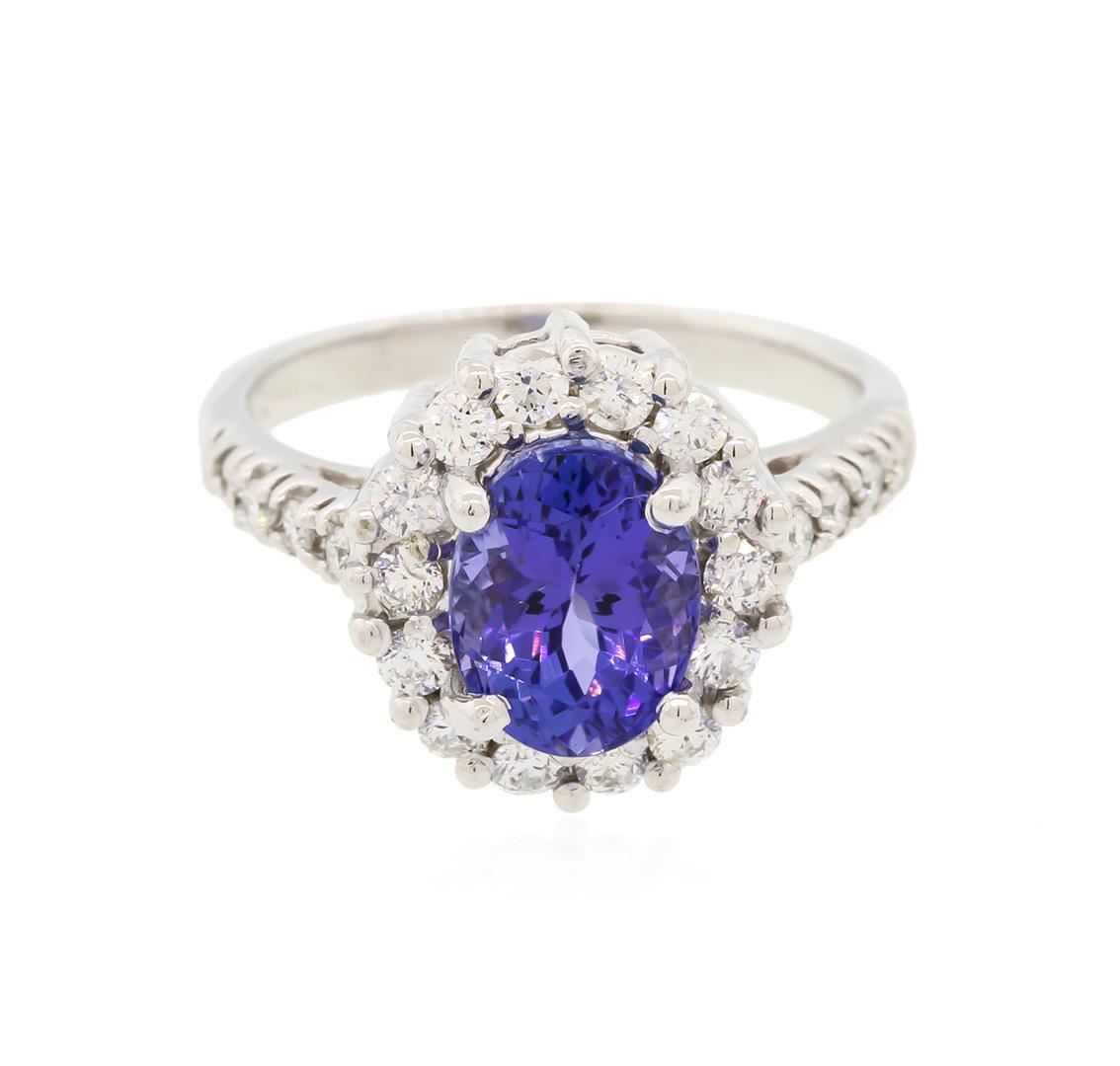 One electronically tested 14KT white gold ladies cast tanzanite and diamond ring with a bright polish finish. The featured tanzanite is set within a diamond bezel supported by diamond set shoulders, completed by a two millimeter wide band. Trademark is 14K. Condition is new, good workmanship. Containing: One prong set oval mixed cut natural tanzanite, measuring 8.65 x 6.63 x 5.77mm, exact weight 2.52ct., clarity is eye clean, type I, medium dark, very slightly grayish, bluish violet color, (GIA bV 6/3), cut is good. Transmitting light with no distortion, transparent. Graded in the setting. Tanzanite is a very rare gemstone that is only found in the country of Tanzania. Originally discovered in 1967. Tiffany & Company, named the stone Tanzanite. It is found in the Usumburu Mountains that border the Umba Valley of northern Tanzania. Tanzanite occurs in gray, brown, violet, blue, reddish-purple, & green. The gem is interesting because of its exceptional pleochroism. Rotated in different directions a tanzanite will exhibit multiple changes of color. Tanzanite has a low tolerance to ultrasonic cleaning, and should not be cleaned using this method. Twenty-Two prong set round brilliant cut diamonds, measuring 2.00 - 1.60 x 1.08mm exact total weight 22 Stones = 0.61ct. Graded in the setting. Clarity: SI-1 to I-1. Color: G - I. Total Weight of Colored Stones 2.52ct. Total Weight of Diamonds 0.61ct. Total Weight of Ring 5.24gm. AIG Appraised at $7,765.00.