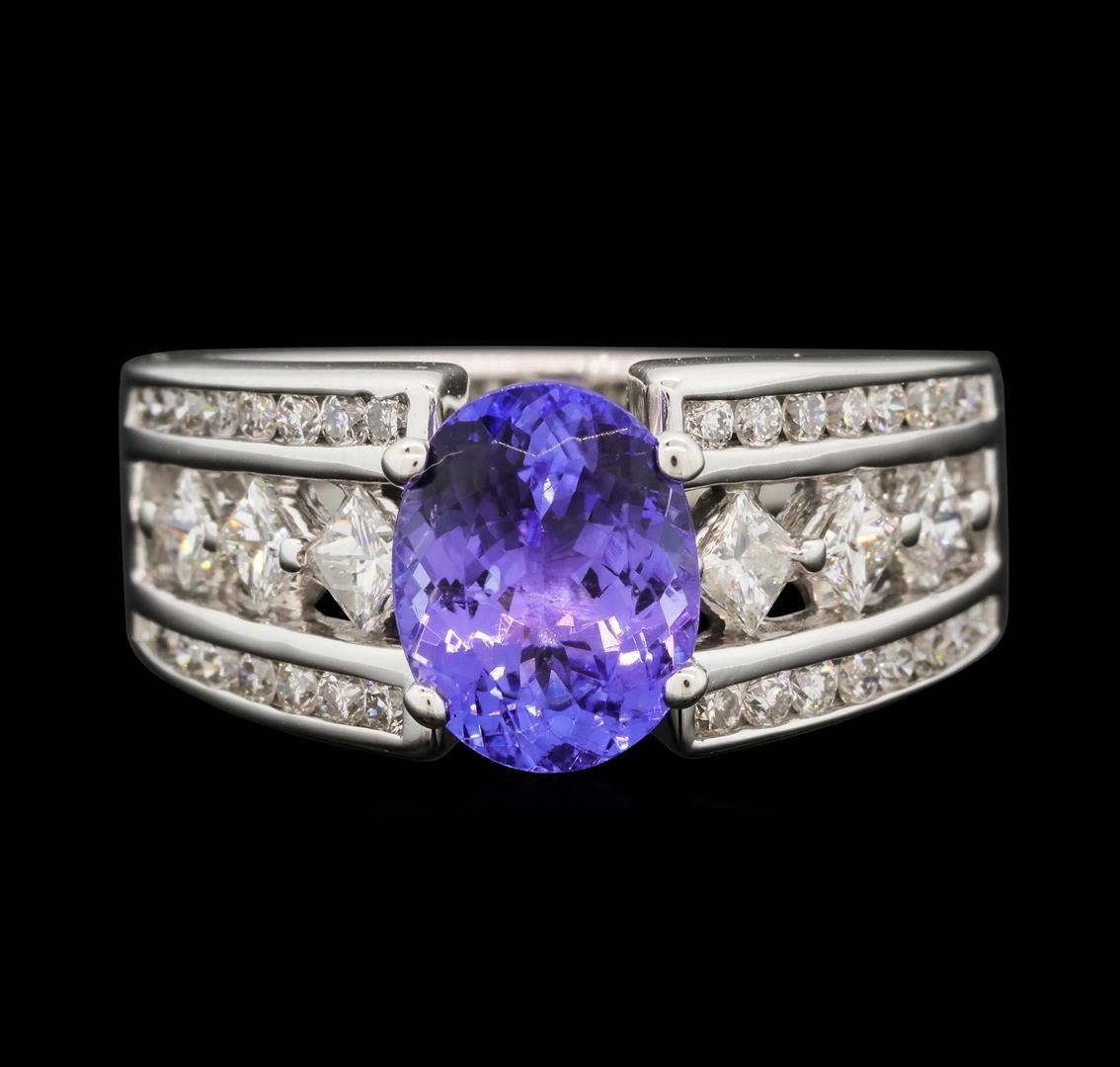 One electronically tested 14KT white gold lady's cast fashion ring with a cathedral shank with a bright polish finish. The featured lady's ring has a shank measuring 4.25 millimeters wide. Identified with markings of "14K". Condition is new, good workmanship. Containing: One prong set oval modified brilliant cut natural tanzanite, measuring 9.50 x 7.35 x 5.25mm, (depth est.) approximate weight of 2.55ct., clarity is slightly included, medium light, moderately strong, bluish violet color, (GIA bV 4/4), cut is very good. Transmitting light with no distortion, transparent. Colored gemstones are presumed to have been subjected to commonly used enhancement processes. Graded in the setting. Six prong set princess cut diamonds, measuring 2.90 x 2.40 x 1.80mm (depth est.) approximate. Total Weight of 6 Stones = 0.62ct. Graded in the setting. Color H - I Clarity SI-1 to I-1 Cut Good Thirty-Two channel set round brilliant cut diamonds, measuring 1.60 - 1.50 x 0.96mm (depth est.) approximate. Total Weight of 32 Stones = 0.45ct. Graded in the setting. Color H - I Clarity SI-1 to I-1 Cut Good. Total Weight of Colored Stones 2.55ct.. Total Weight of Diamonds 1.07ct.. Total Weight of Ring 8.30gm. GAS Appraised.