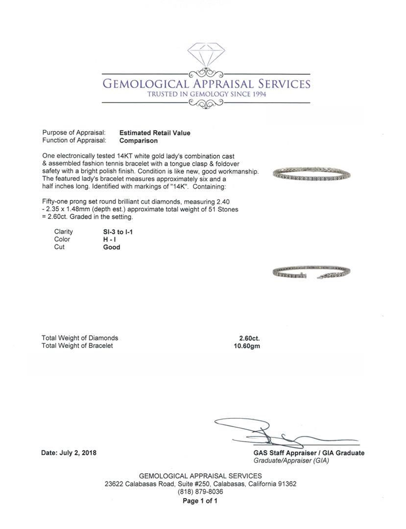 One electronically tested 14KT white gold lady's combination cast & assembled fashion tennis bracelet with a tongue clasp & foldover safety with a bright polish finish. The featured lady's bracelet measures approximately six and a half inches long. Identified with markings of '14K'. Condition is like new, good workmanship. Containing: Fifty-One prong set round brilliant cut diamonds, measuring 2.40 - 2.35 x 1.48mm (depth est.) approximate total weight of 51 Stones = 2.60ct. Graded in the setting. Color H - I Clarity SI-3 to I-1 Cut Good. Total Weight of Diamonds 2.60ct. Total Weight of Bracelet 10.60gm. GAS Appraised.