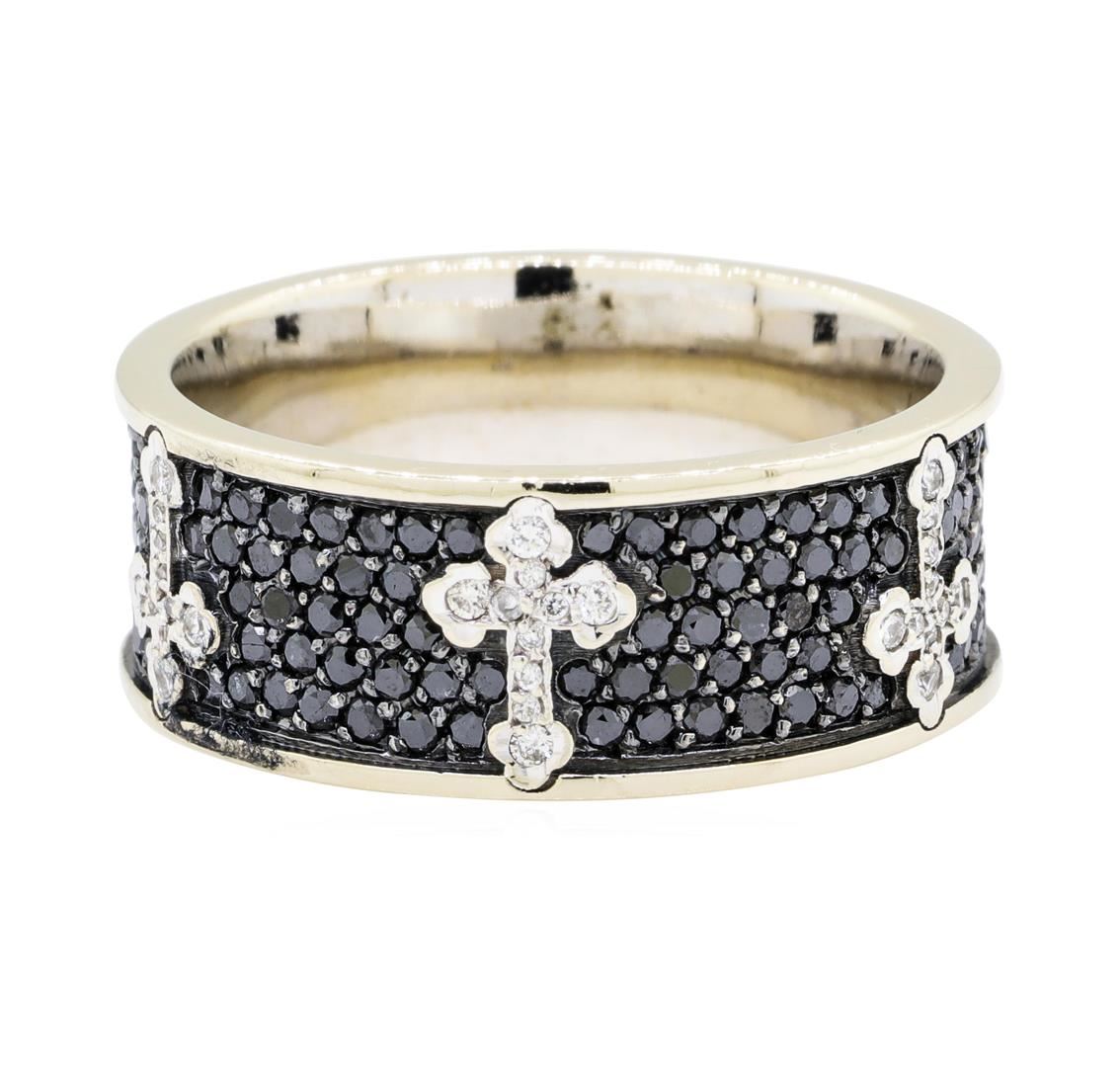 One electronically tested 14KT white gold man's cast fashion band with a bright polish finish. The featured man's ring has a shank measuring 9.20 millimeters wide. Identified with markings of '14K'. Condition is like new, good workmanship. Containing: Twenty-Four prong set round brilliant cut diamonds, measuring 1.30 - 1.25 x 0.79mm (depth est.) approximate total weight of 24 Stones = 0.19ct. Graded in the setting. Color H - I Clarity SI-2 to I-1 Cut Good Thirty-Six prong set round brilliant cut diamonds, measuring 1.00 - 0.95 x 0.61mm (depth est.) approximate total weight of 36 Stones = 0.13ct. Graded in the setting. Color H - I Clarity SI-2 to I-1 Cut Good One Hundred Eighty-Six prong set round brilliant cut diamonds, measuring 1.50 - 1.45 x 0.93mm (depth est.) approximate total weight of 186 Stones = 2.30ct. Graded in the setting. Color Fancy Black Cut Good. Total Weight of Diamonds 2.62ct.. Total Weight of Band 10.60gm. GAS Appraised.