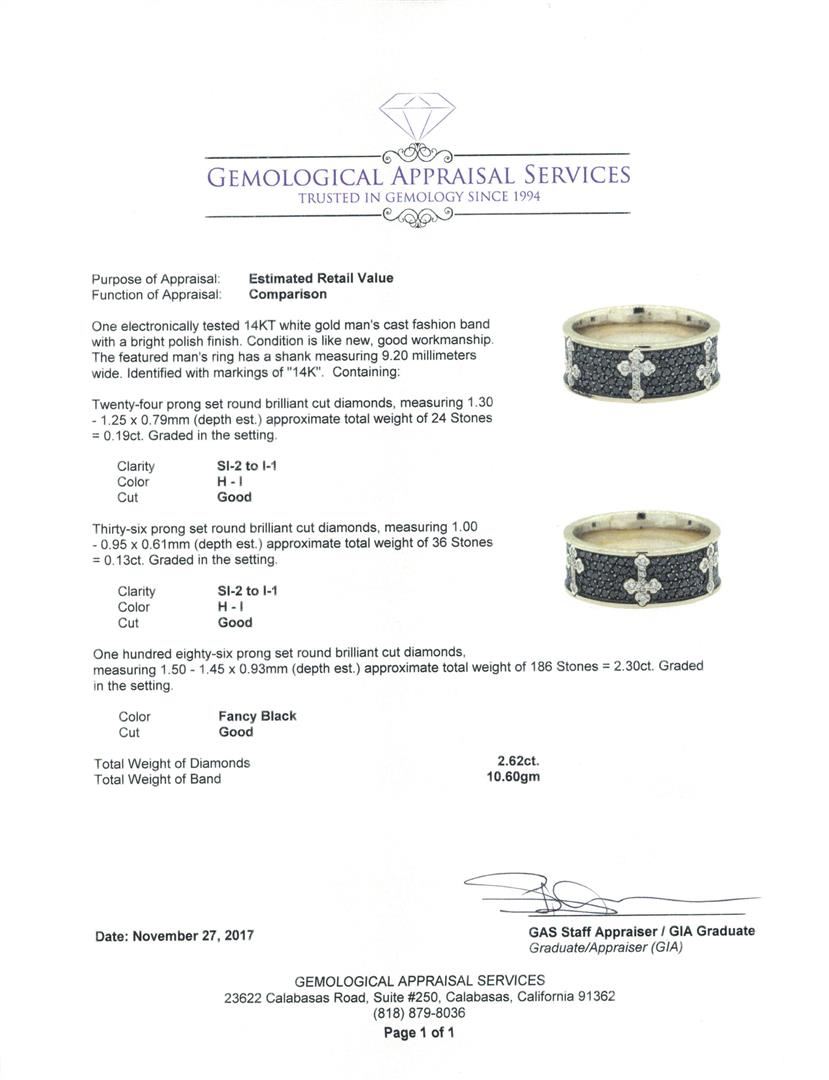 One electronically tested 14KT white gold man's cast fashion band with a bright polish finish. The featured man's ring has a shank measuring 9.20 millimeters wide. Identified with markings of '14K'. Condition is like new, good workmanship. Containing: Twenty-Four prong set round brilliant cut diamonds, measuring 1.30 - 1.25 x 0.79mm (depth est.) approximate total weight of 24 Stones = 0.19ct. Graded in the setting. Color H - I Clarity SI-2 to I-1 Cut Good Thirty-Six prong set round brilliant cut diamonds, measuring 1.00 - 0.95 x 0.61mm (depth est.) approximate total weight of 36 Stones = 0.13ct. Graded in the setting. Color H - I Clarity SI-2 to I-1 Cut Good One Hundred Eighty-Six prong set round brilliant cut diamonds, measuring 1.50 - 1.45 x 0.93mm (depth est.) approximate total weight of 186 Stones = 2.30ct. Graded in the setting. Color Fancy Black Cut Good. Total Weight of Diamonds 2.62ct.. Total Weight of Band 10.60gm. GAS Appraised.