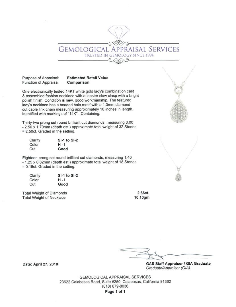 One electronically tested 14KT white gold Ladies combination cast & assembled fashion necklace with a lobster claw clasp with a bright polish finish. The featured Ladies necklace has a beaded halo motif with a 1.3mm diamond cut cable link chain measuring approximately 16 inches in length. Identified with markings of '14K'. Condition is new, good workmanship. Containing: Thirty-Two prong set round brilliant cut diamonds, measuring 3.00 - 2.50 x 1.70mm (depth est.) approximate total weight of 32 Stones = 2.50ct. Graded in the setting. Color H - I Clarity SI-1 to SI-2 Cut Good Eighteen prong set round brilliant cut diamonds, measuring 1.40 - 1.25 x 0.82mm (depth est.) approximate total weight of 18 Stones = 0.16ct. Graded in the setting. Color H - I Clarity SI-1 to SI-2 Cut Good. Total Weight of Diamonds 2.66ct.. Total Weight of Necklace 10.10gm. GAS Appraised.