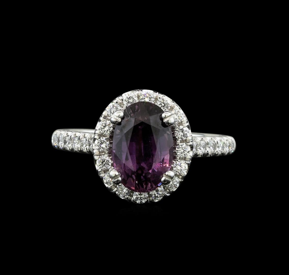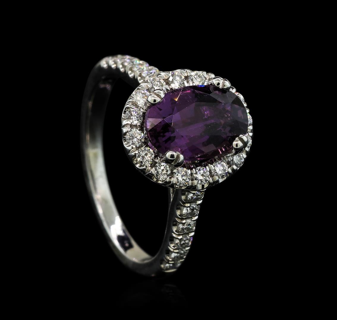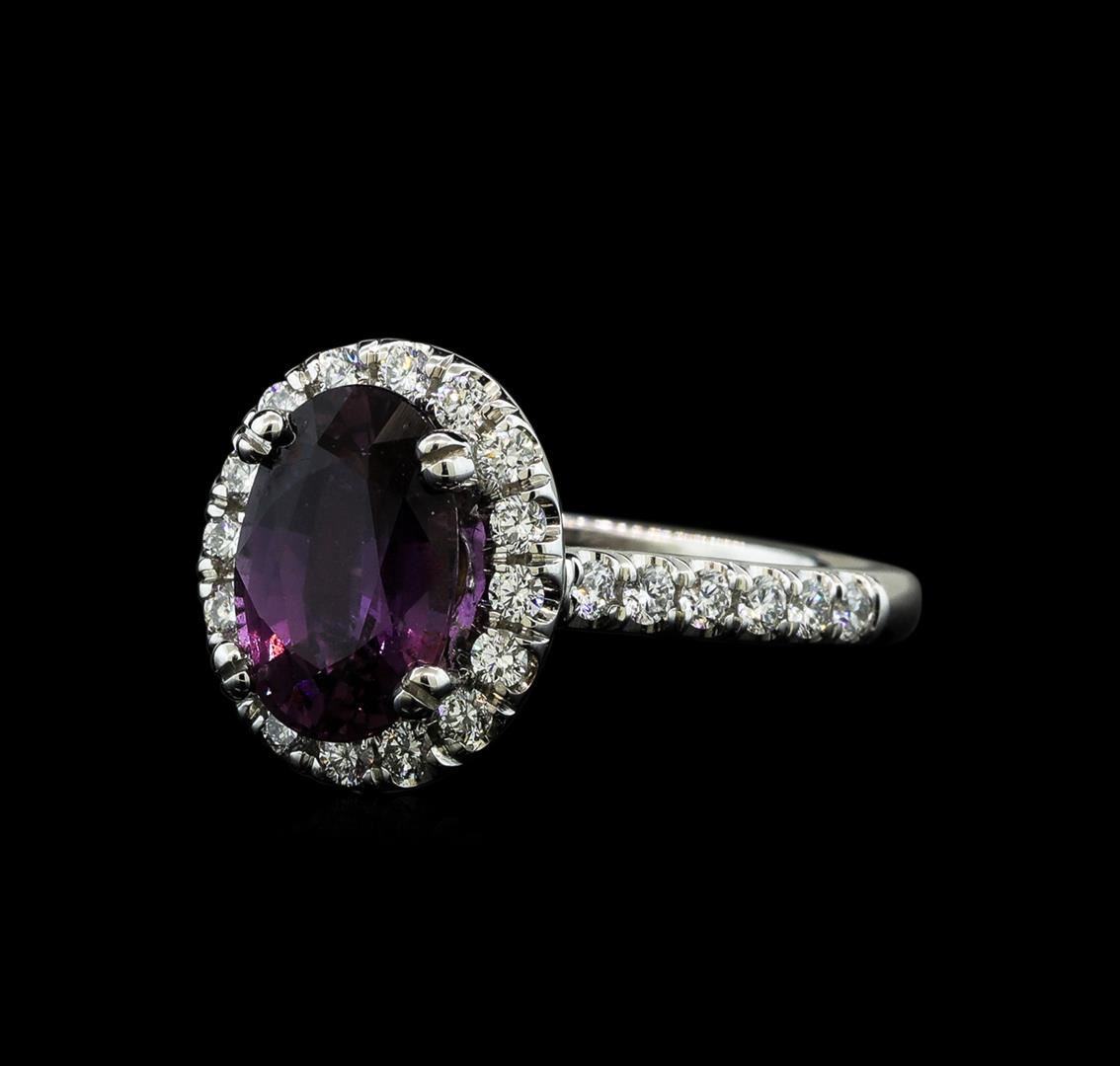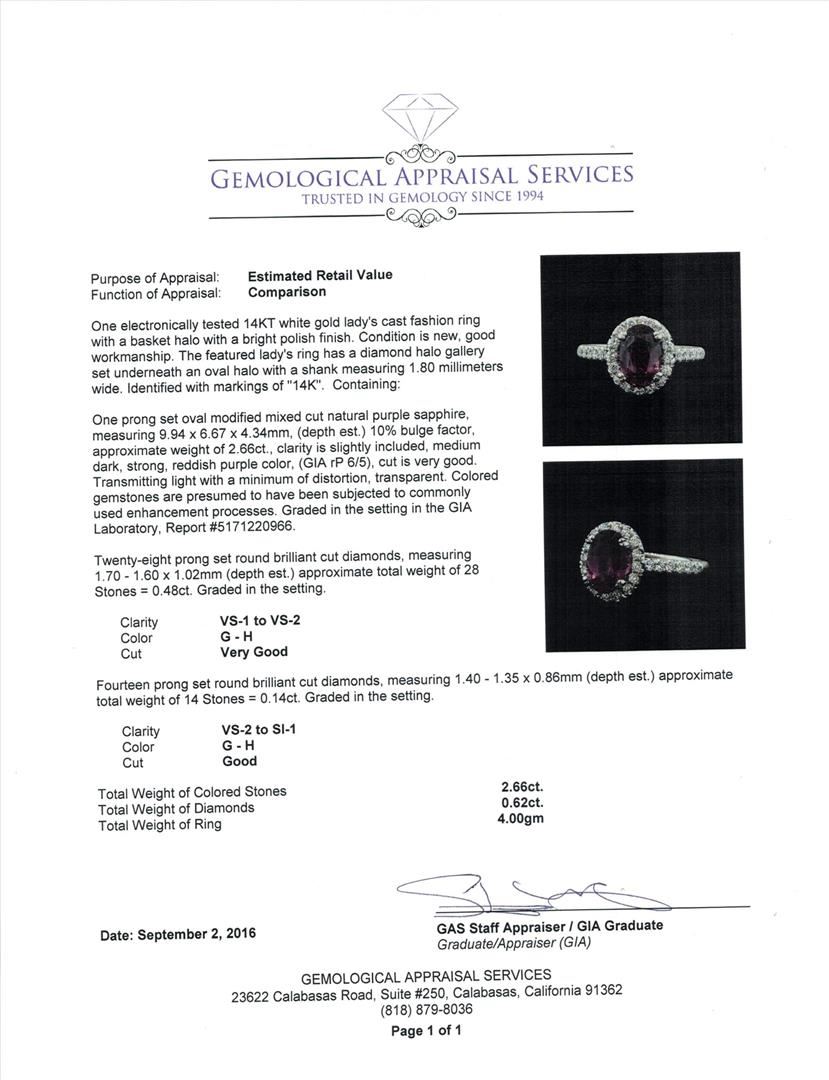 One electronically tested 14KT white gold lady's cast fashion ring with a basket halo with a bright polish finish. The featured lady's ring has a diamond halo gallery set underneath an oval halo with a shank measuring 1.80 millimeters wide. Identified with markings of "14K". Condition is new, good workmanship. Containing: One prong set oval modified mixed cut natural purple sapphire, measuring 9.94 x 6.67 x 4.34mm, (depth est.) 10%. bulge factor, approximate weight of 2.66ct., clarity is slightly included, medium dark, strong, reddish purple color, (GIA rP 6/5), cut is very good. Transmitting light with a minimum of distortion, transparent. Colored gemstones are presumed to have been subjected to commonly used enhancement processes. Graded in the setting in the GIA Laboratory, Report #5171220966.Twenty-Eight prong set round brilliant cut diamonds, measuring 1.70 - 1.60 x 1.02mm (depth est.) approximate total weight of 28 Stones = 0.48ct. Graded in the setting. Clarity: VS-1 to VS-2. Color: G - HCut Very Good Fourteen prong set round brilliant cut diamonds, measuring 1.40 - 1.35 x 0.86mm (depth est.) approximate total weight of 14 Stones = 0.14ct. Graded in the setting. Clarity: VS-2 to SI-1. Color: G - HCut Good. Total Weight of Colored Stones 2.66ct. Total Weight of Diamonds 0.62ct. Total Weight of Ring 4.00gm. GAS Appraised.