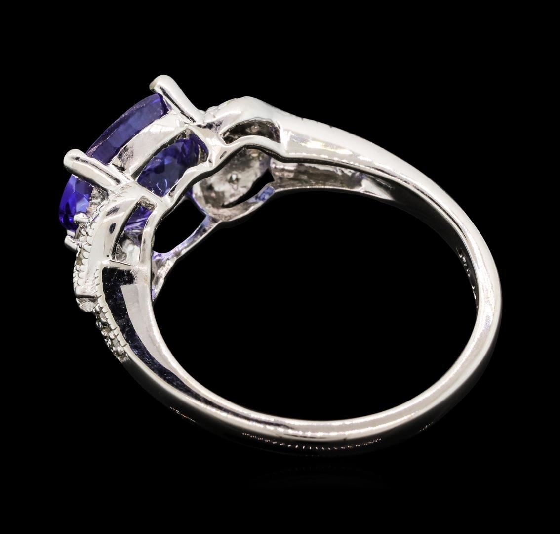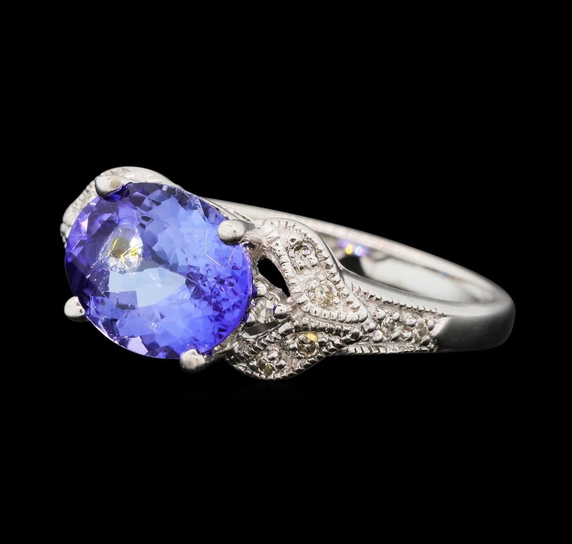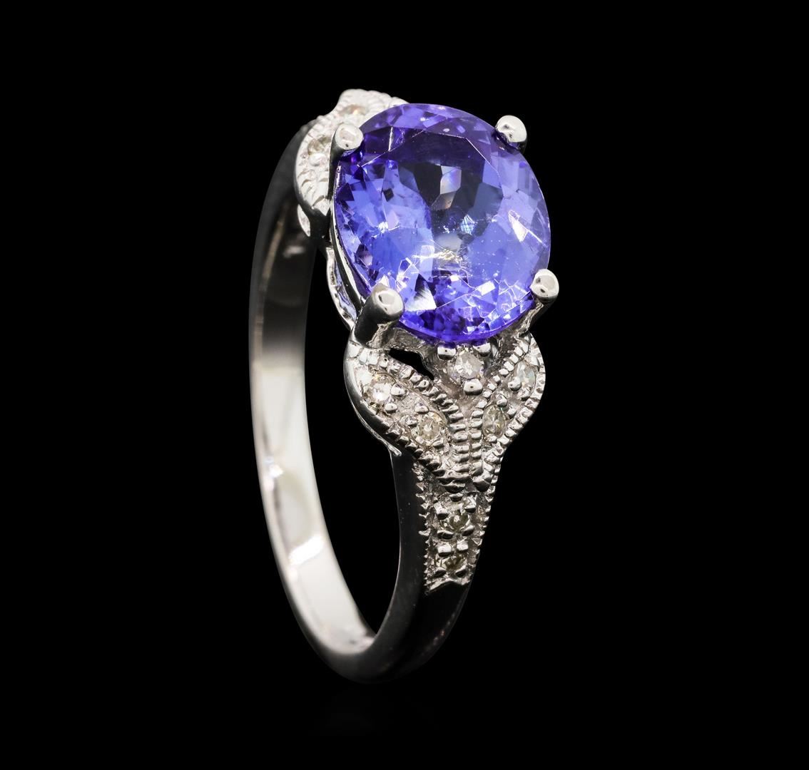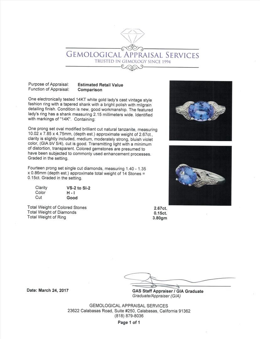 One electronically tested 14KT white gold lady's cast vintage style fashion ring with a tapered shank with a bright polish with milgrain detailing finish. The featured lady's ring has a shank measuring 2.15 millimeters wide. Identified with markings of "14K". Condition is new, good workmanship. Containing: One prong set oval modified brilliant cut natural tanzanite, measuring 10.02 x 7.85 x 4.75mm, (depth est.) approximate weight of 2.67ct., clarity is slightly included, medium, moderately strong, bluish violet color, (GIA bV 5/4), cut is good. Transmitting light with a minimum of distortion, transparent. Colored gemstones are presumed to have been subjected to commonly used enhancement processes. Graded in the setting. Fourteen prong set single cut diamonds, measuring 1.40 - 1.35 x 0.86mm (depth est.) approximate. Total Weight of 14 Stones = 0.15ct. Graded in the setting. Color H - I Clarity VS-2 to SI-2 Cut Good. Total Weight of Colored Stones 2.67ct.. Total Weight of Diamonds 0.15ct.. Total Weight of Ring 3.80gm. GAS Appraised.