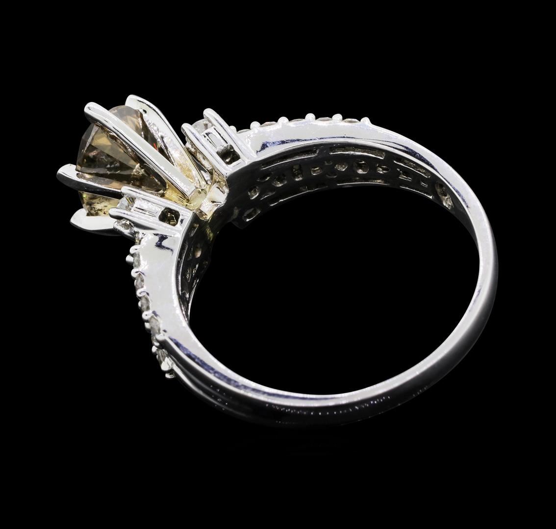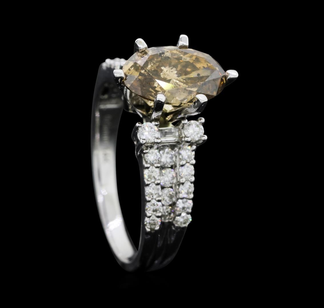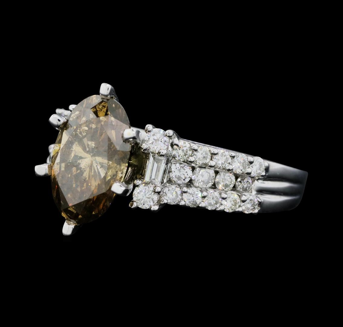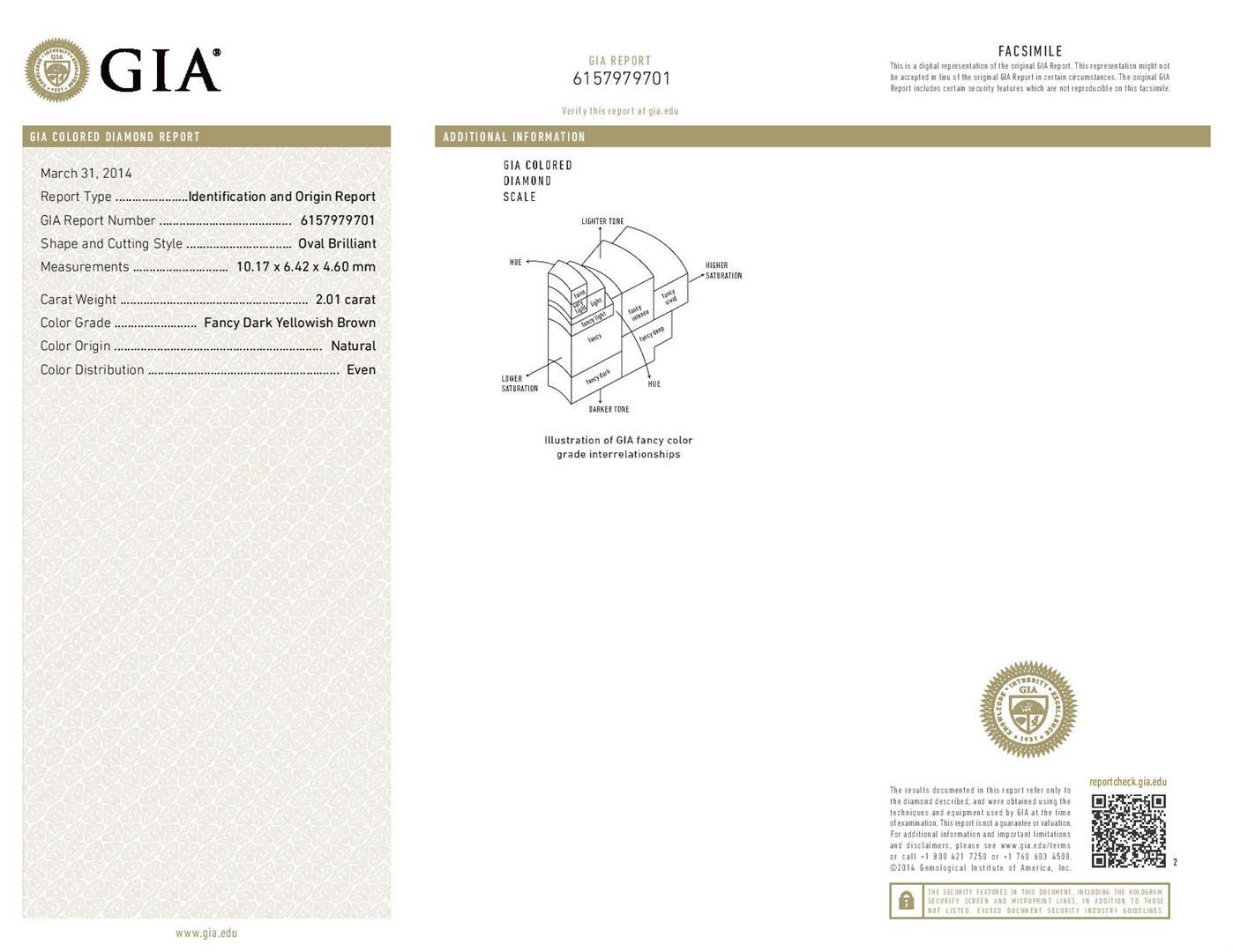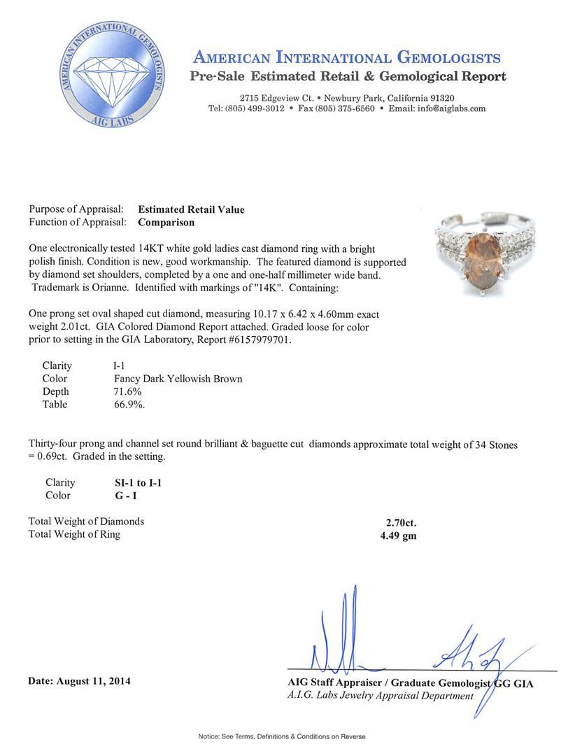 One electronically tested 14KT white gold ladies cast diamond ring with a bright polish finish. The featured diamond is supported by diamond set shoulders, completed by a one and one-half millimeter wide band. Trademark is Orianne. Identified with markings of "14K". Condition is new, good workmanship. Containing: One prong set oval shaped cut diamond, measuring 10.17 x 6.42 x 4.60mm exact weight 2.01ct. GIA Colored Diamond Report attached. Graded loose for color prior to setting in the GIA Laboratory, Report #6157979701. Clarity I-1. Color: Fancy Dark Yellowish Brown. Depth: 71.6%. Table: 66.9%. Thirty-Four prong and channel set round brilliant & baguette cut diamonds approximate total weight of 34 Stones = 0.69ct. Graded in the setting. Clarity: SI-1 to I-1. Color: G - I. Total Weight of Diamonds 2.70ct. Total Weight of Ring 4.49gm. AIG Appraised.