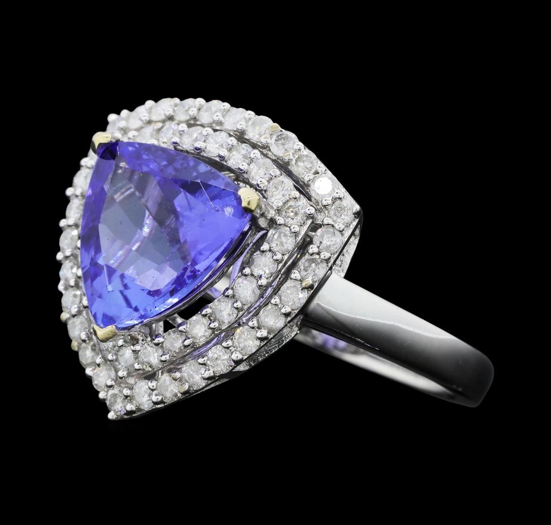One electronically tested 14KT white gold ladies cast tanzanite & diamond ring with a bright finish. The tanzanite is set within a diamond bezel, supported by an elaborate lattice under gallery, completed by a two millimeter wide band. Trademark is Orianne. Identified with markings of "14K". Condition is new, good workmanship. Containing: One prong set triangle mixed cut natural tanzanite, measuring 9.80 x 9.50 x 4.30mm, approximate weight of 2.71ct., clarity is slightly included, type I, medium dark, very slightly grayish, violetish blue color, (GIA vB 6/3), cut is good. Transmitting light with no distortion, transparent. Graded in the setting. Tanzanite is a very rare gemstone that is only found in the country of Tanzania. Originally discovered in 1967. Tiffany & Company, named the stone Tanzanite. It is found in the Usumburu Mountains that border the Umba Valley of northern Tanzania. Tanzanite occurs in gray, brown, violet, blue, reddish-purple, & green. The gem is interesting because of its exceptional pleochroism. Rotated in different directions a tanzanite will exhibit multiple changes of color. Tanzanite has a low tolerance to ultrasonic cleaning, and should not be cleaned using this method. Fifty-Four prong set round brilliant cut diamonds approximate total weight of 54 Stones = 0.63ct. Graded in the setting. Clarity: I-2 to I-3. Color: G - H. Total Weight of Colored Stones 2.71ct.. Total Weight of Diamonds 0.63ct.. Total Weight of Ring 4.46gm. AIG Appraised.