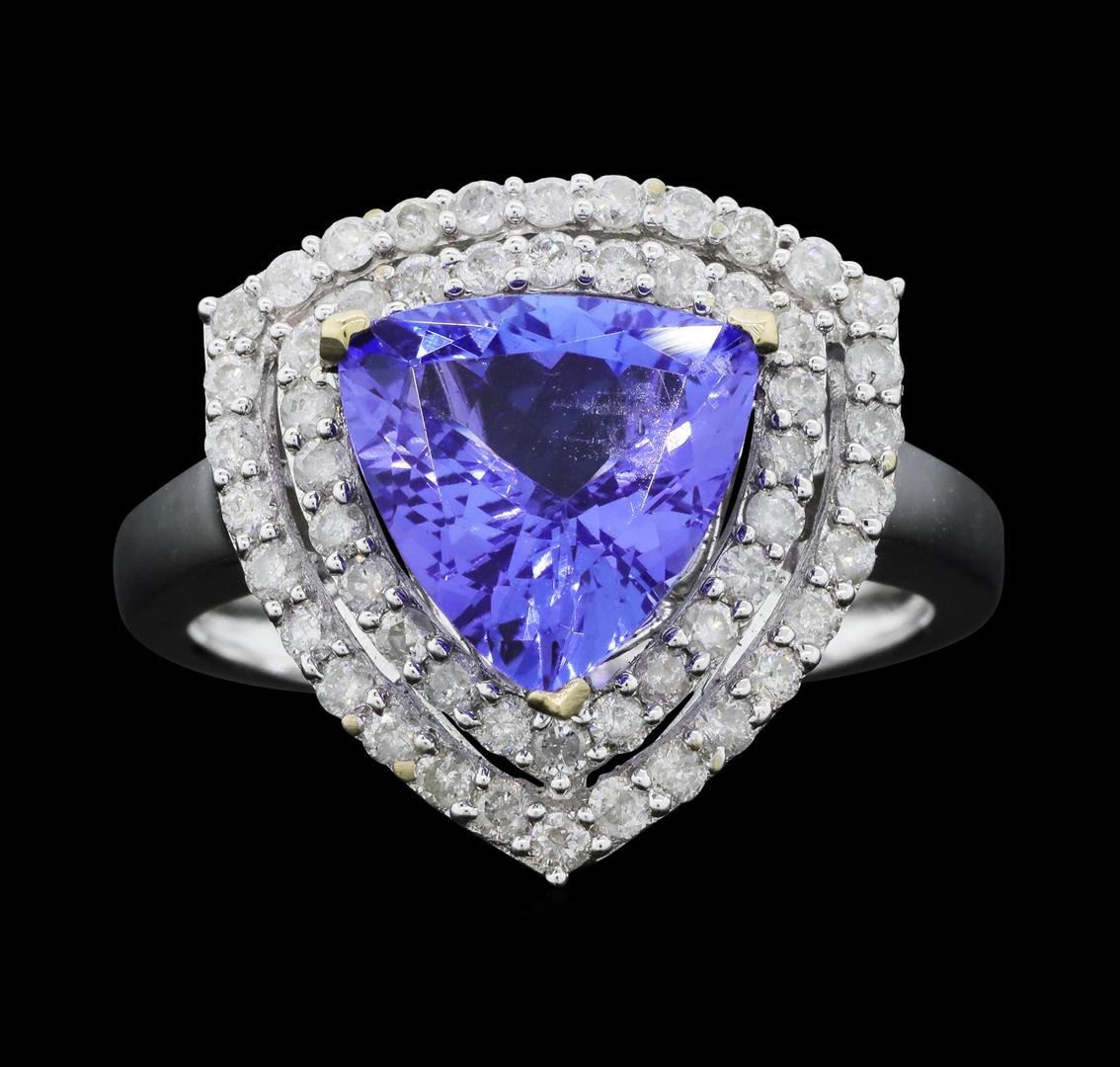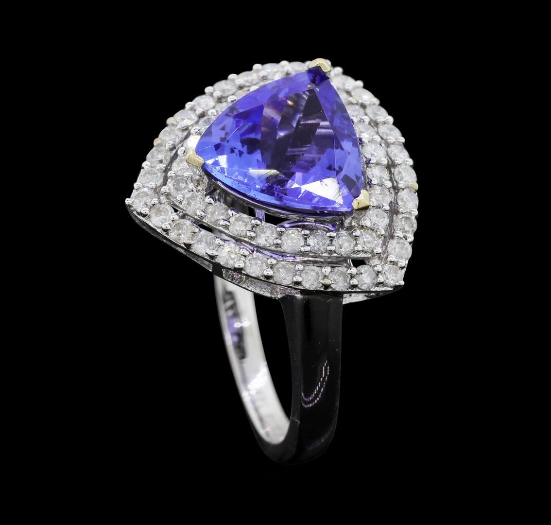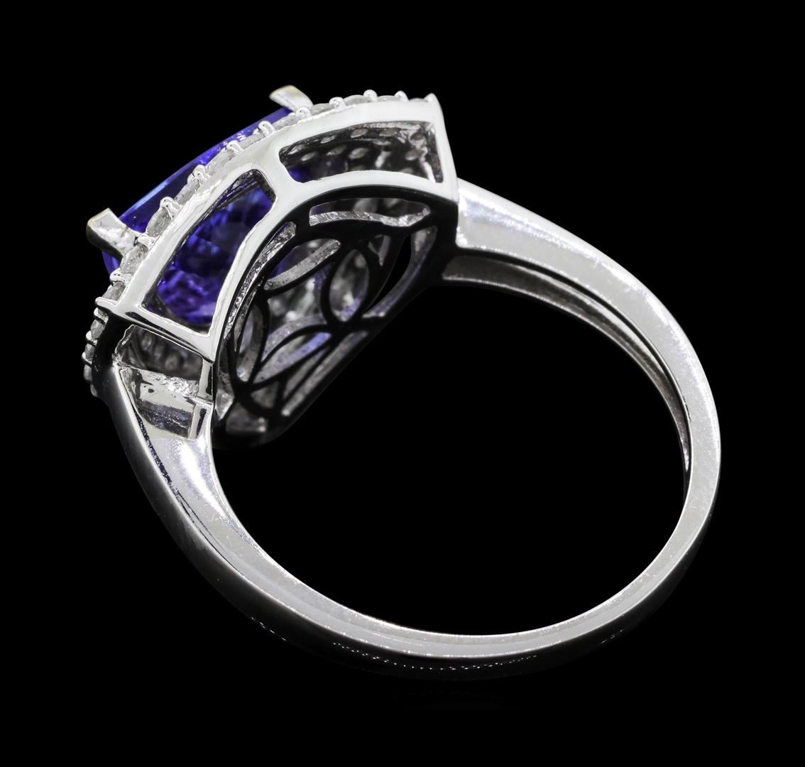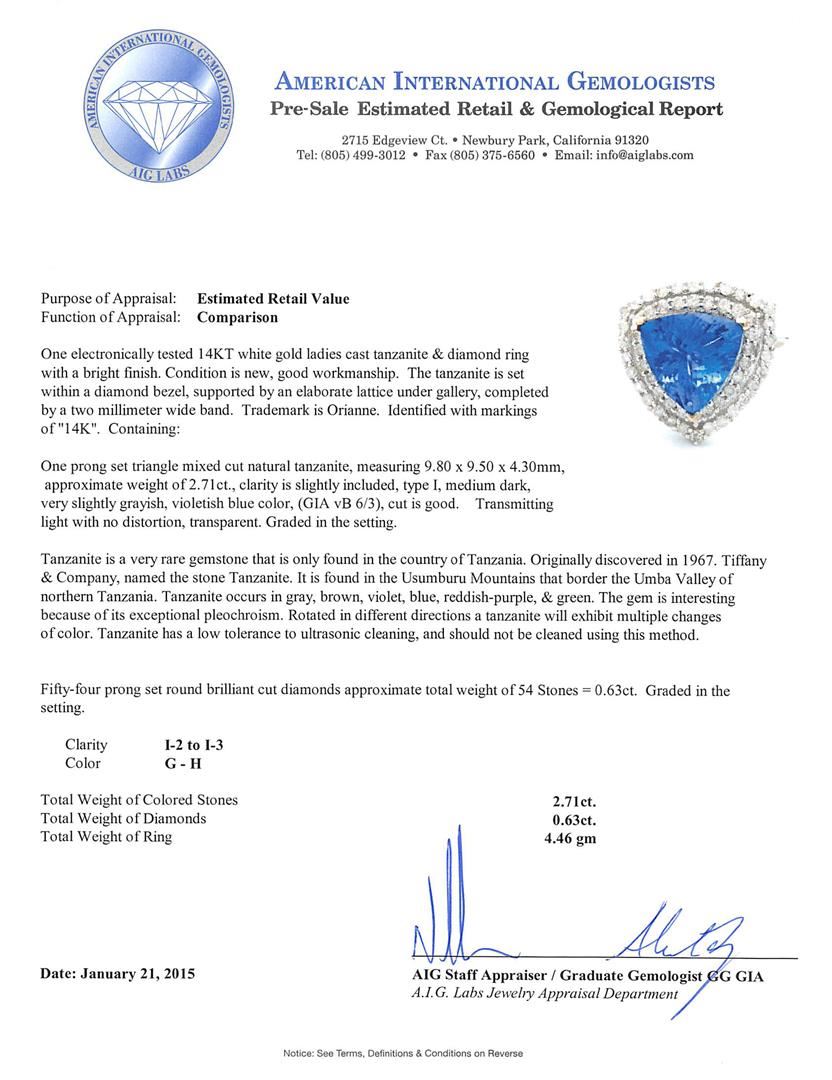 One electronically tested 14KT white gold ladies cast tanzanite & diamond ring with a bright finish. The tanzanite is set within a diamond bezel, supported by an elaborate lattice under gallery, completed by a two millimeter wide band. Trademark is Orianne. Identified with markings of "14K". Condition is new, good workmanship. Containing: One prong set triangle mixed cut natural tanzanite, measuring 9.80 x 9.50 x 4.30mm, approximate weight of 2.71ct., clarity is slightly included, type I, medium dark, very slightly grayish, violetish blue color, (GIA vB 6/3), cut is good. Transmitting light with no distortion, transparent. Graded in the setting. Tanzanite is a very rare gemstone that is only found in the country of Tanzania. Originally discovered in 1967. Tiffany & Company, named the stone Tanzanite. It is found in the Usumburu Mountains that border the Umba Valley of northern Tanzania. Tanzanite occurs in gray, brown, violet, blue, reddish-purple, & green. The gem is interesting because of its exceptional pleochroism. Rotated in different directions a tanzanite will exhibit multiple changes of color. Tanzanite has a low tolerance to ultrasonic cleaning, and should not be cleaned using this method. Fifty-Four prong set round brilliant cut diamonds approximate total weight of 54 Stones = 0.63ct. Graded in the setting. Clarity: I-2 to I-3. Color: G - H. Total Weight of Colored Stones 2.71ct.. Total Weight of Diamonds 0.63ct.. Total Weight of Ring 4.46gm. AIG Appraised.