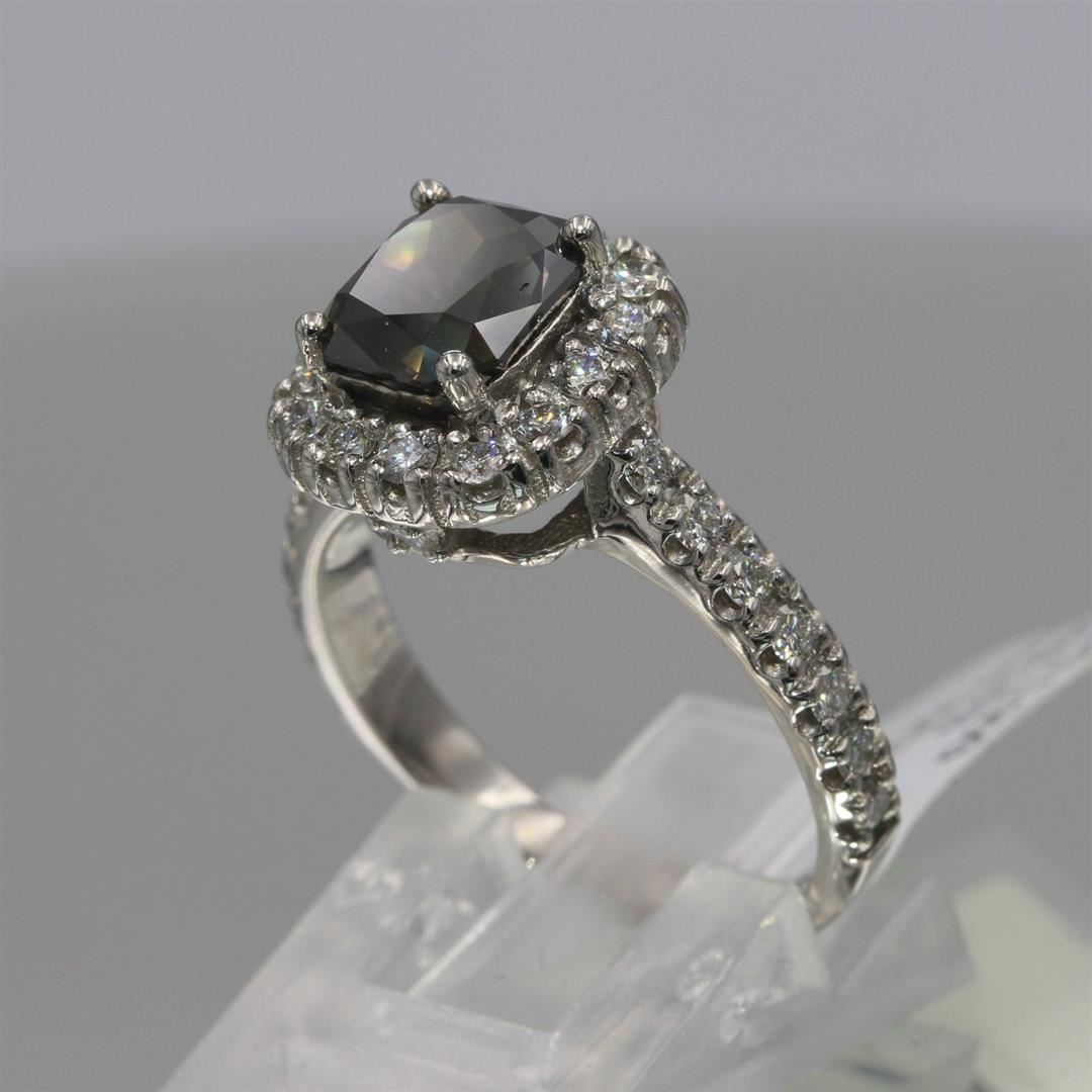 One Cushion Cut Fancy Brown Diamond Engagement Halo Ring in 14k White Gold. Total gram weight of ring is 5.90g. Total carat weight is 2.76 carats with a total of 31 diamonds. Condition is brand new. Main diamond is not enhanced / natural and shape is cushion cut. Main diamond is 2.03 carats, clarity SI1 - SI2, color fancy brown / cognac, and cut is excellent. The side diamond is not enhanced and natural. Side diamonds total carat weight is 0.73 carats, color G-H, clarity SI1- SI2, shape is round cut, and cut is excellent.