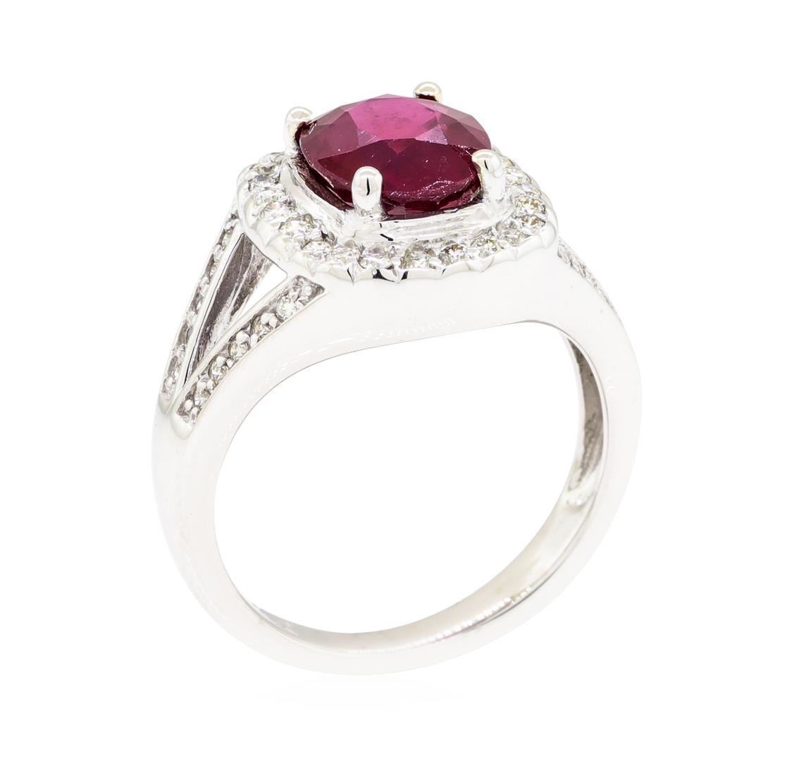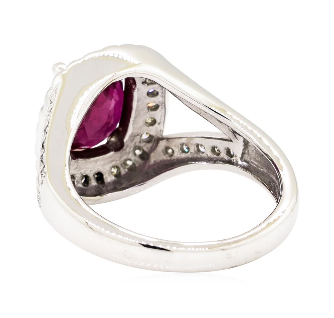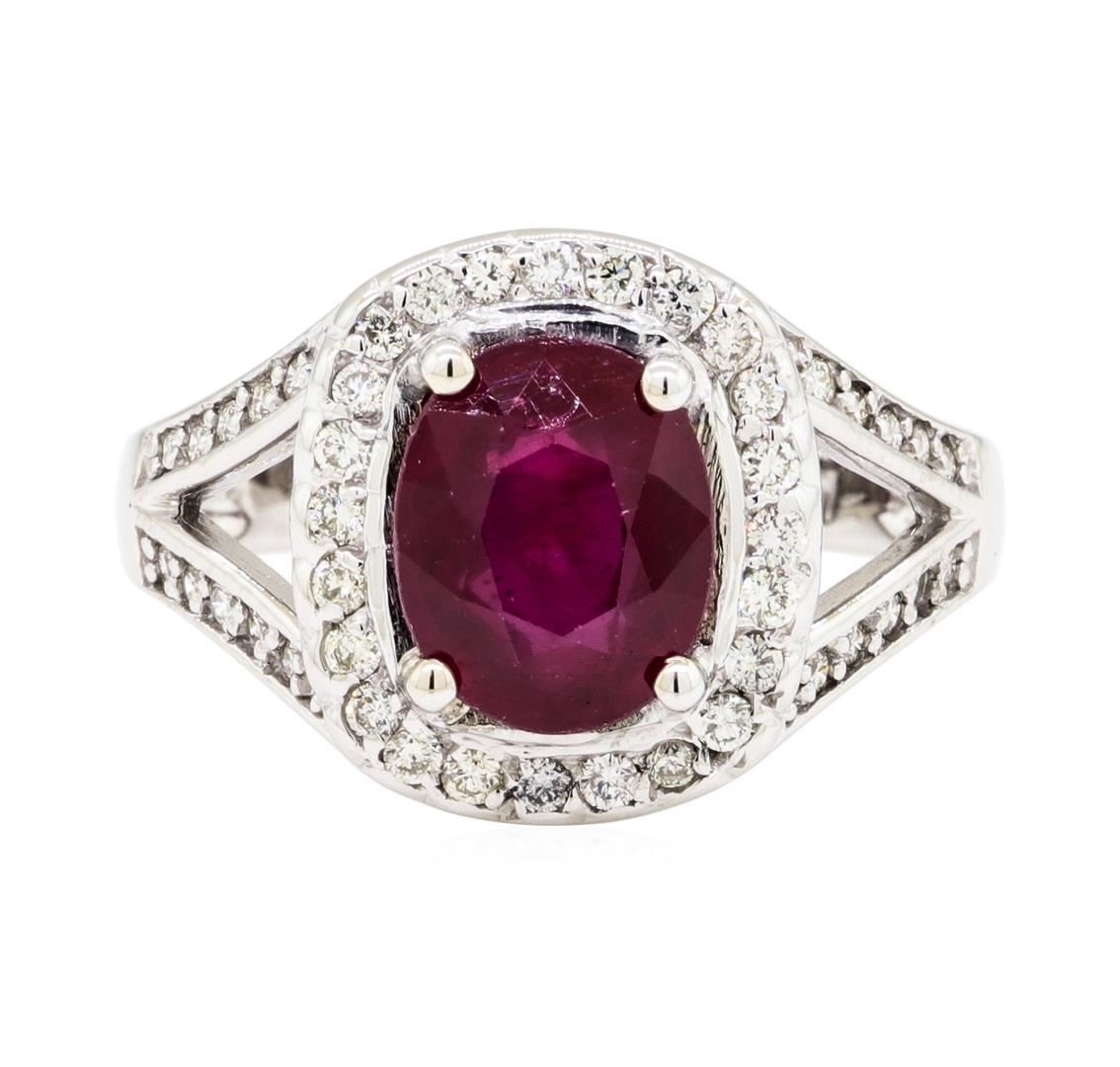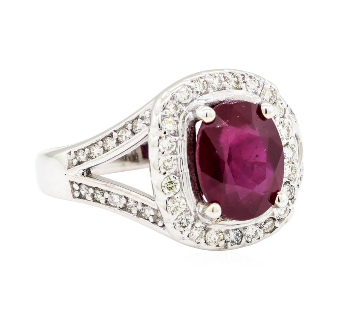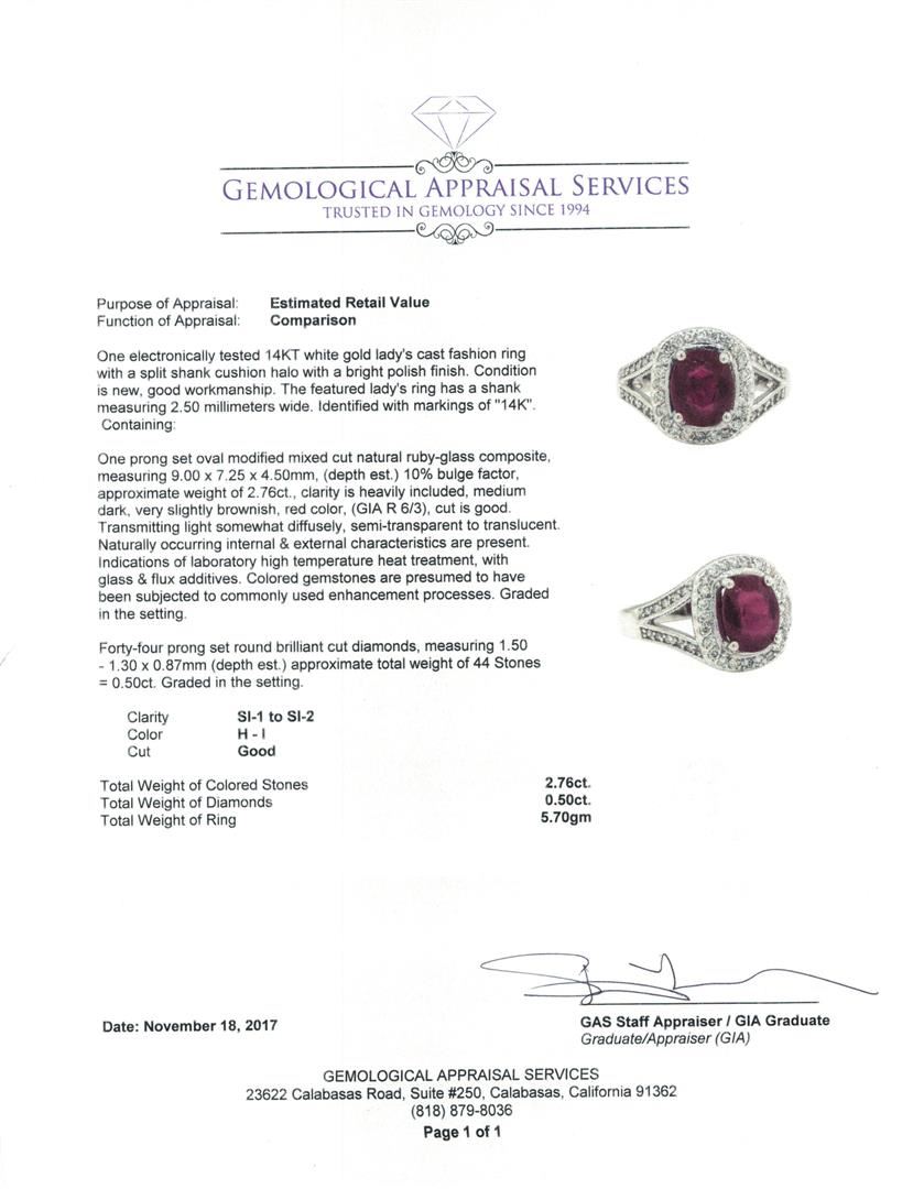 One electronically tested 14KT white gold lady's cast fashion ring with a split shank cushion halo with a bright polish finish. The featured lady's ring has a shank measuring 2.50 millimeters wide. Identified with markings of '14K'. Condition is new, good workmanship. Containing: One prong set oval modified mixed cut natural ruby-glass composite, measuring 9.00 x 7.25 x 4.50mm, (depth est.) 10%. bulge factor, approximate weight of 2.76ct., clarity is heavily included, medium dark, very slightly brownish, red color, (GIA R 6/3), cut is good. Transmitting light somewhat diffusely, semi-transparent to translucent. Naturally occurring internal & external characteristics are present. Indications of laboratory high temperature heat treatment, with glass & flux additives. Colored gemstones are presumed to have been subjected to commonly used enhancement processes. Graded in the setting. Forty-Four prong set round brilliant cut diamonds, measuring 1.50 - 1.30 x 0.87mm (depth est.) approximate total weight of 44 Stones = 0.50ct. Graded in the setting. Color H - I Clarity SI-1 to SI-2 Cut Good. Total Weight of Colored Stones 2.76ct.. Total Weight of Diamonds 0.50ct.. Total Weight of Ring 5.70gm. GAS Appraised.