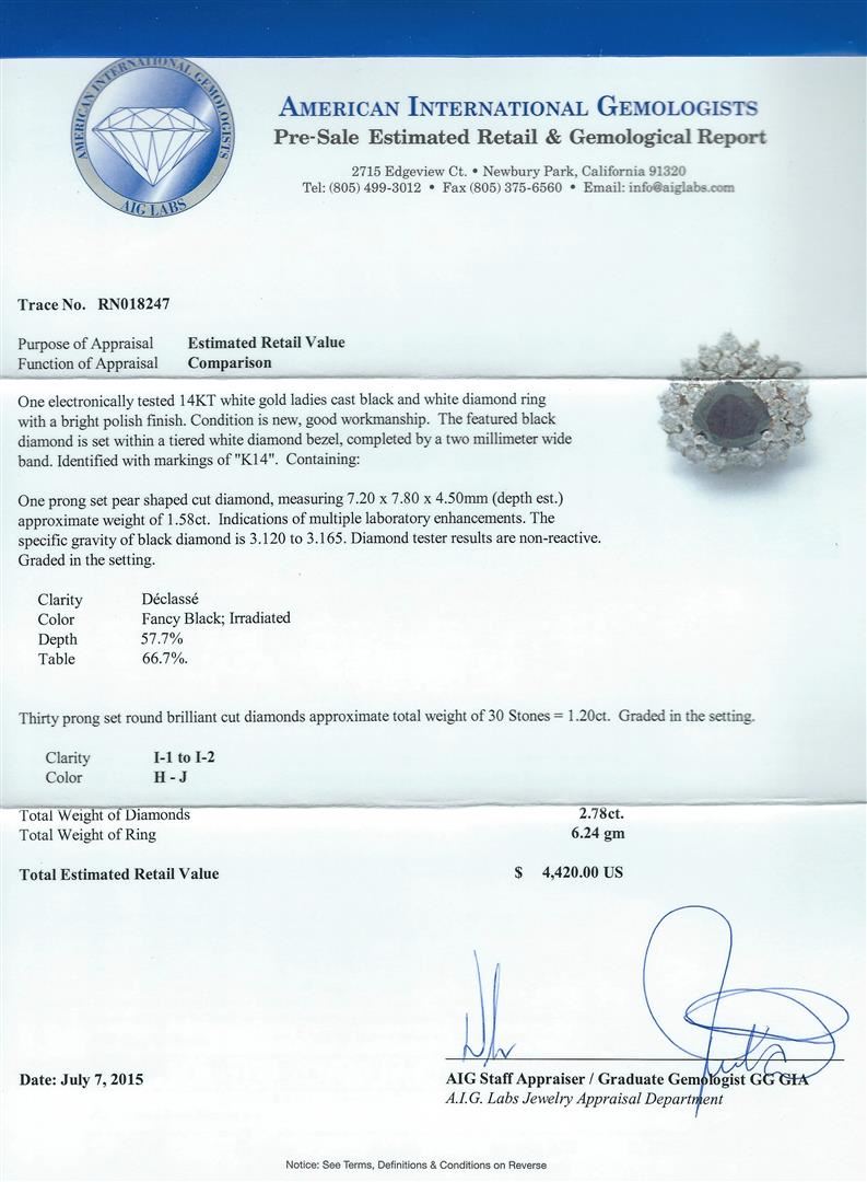 One electronically tested 14KT white gold ladies cast black and white diamond ring with a bright polish finish. The featured black diamond is set within a tiered white diamond bezel, completed by a two millimeter wide band. Identified with markings of "K14". Condition is new, good workmanship. Containing: One prong set pear shaped cut diamond, measuring 7.20 x 7.80 x 4.50mm (depth est.) approximate weight of 1.58ct. Indications of multiple laboratory enhancements. The specific gravity of black diamond is 3.120 to 3.165. Diamond tester results are non-reactive. Graded in the setting. Clarity D‚class‚. Color: Fancy Black; Irradiated. Depth: 57.7%. Table: 66.7%. Thirty prong set round brilliant cut diamonds approximate. Total Weight of 30 Stones = 1.20ct. Graded in the setting. Clarity: I-1 to I-2. Color: H - J. Total Weight of Diamonds 2.78ct. AIG Appraised at $4,420.00.