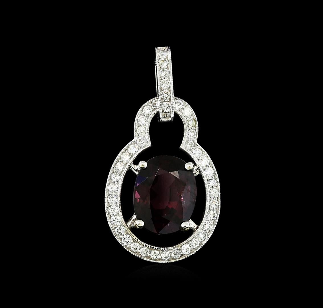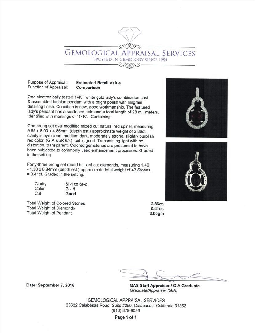 One electronically tested 14KT white gold lady's combination cast & assembled fashion pendant with a bright polish with milgrain detailing finish. The featured lady's pendant has a scalloped halo and a total length of 28 millimeters. Identified with markings of "14K". Condition is new, good workmanship. Containing: One prong set oval modified mixed cut natural red spinel, measuring 9.85 x 8.00 x 4.85mm, (depth est.) approximate weight of 2.86ct., clarity is eye clean, medium dark, moderately strong, slightly purplish red color, (GIA slpR 6/4), cut is good. Transmitting light with no distortion, transparent. Colored gemstones are presumed to have been subjected to commonly used enhancement processes. Graded in the setting.Forty-Three prong set round brilliant cut diamonds, measuring 1.40 - 1.30 x 0.84mm (depth est.) approximate total weight of 43 Stones = 0.41ct. Graded in the setting. Clarity: SI-1 to SI-2. Color: G - HCut Good. Total Weight of Colored Stones 2.86ct. Total Weight of Diamonds 0.41ct. Total Weight of Pendant 3.00gm. GAS Appraised.