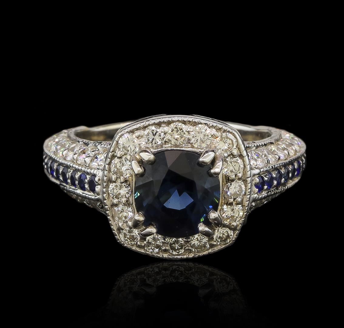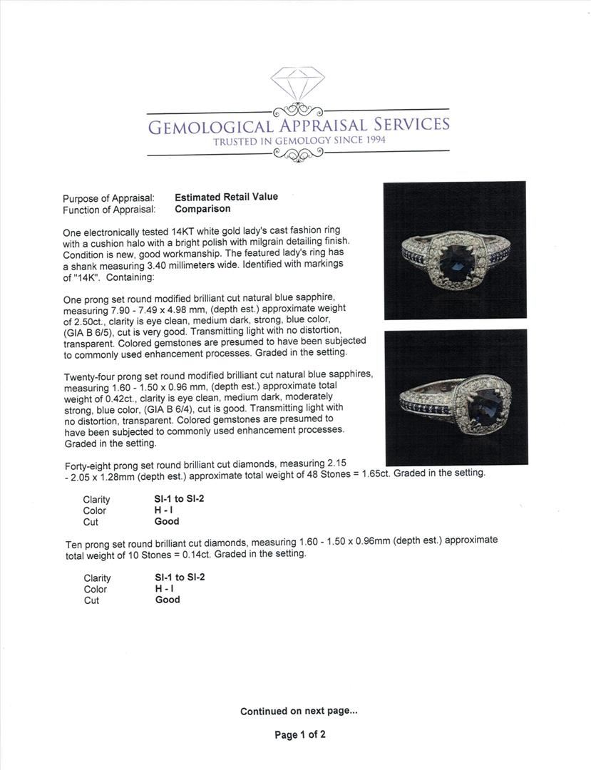 One electronically tested 14KT white gold lady's cast fashion ring with a cushion halo with a bright polish with milgrain detailing finish. The featured lady's ring has a shank measuring 3.40 millimeters wide. Identified with markings of "14K". Condition is new, good workmanship. Containing: One prong set round modified brilliant cut natural blue sapphire, measuring 7.90 - 7.49 x 4.98 mm, (depth est.) approximate weight of 2.50ct., clarity is eye clean, medium dark, strong, blue color, (GIA B 6/5), cut is very good. Transmitting light with no distortion, transparent. Colored gemstones are presumed to have been subjected to commonly used enhancement processes. Graded in the setting.Twenty-four prong set round modified brilliant cut natural blue sapphires, measuring 1.60 - 1.50 x 0.96 mm, (depth est.) approximate total weight of 0.42ct., clarity is eye clean, medium dark, moderately strong, blue color, (GIA B 6/4), cut is good. Transmitting light with no distortion, transparent. Colored gemstones are presumed to have been subjected to commonly used enhancement processes. Graded in the setting.Forty-Eight prong set round brilliant cut diamonds, measuring 2.15 - 2.05 x 1.28mm (depth est.) approximate total weight of 48 Stones = 1.65ct. Graded in the setting. Clarity: SI-1 to SI-2. Color: H - ICut Good Ten prong set round brilliant cut diamonds, measuring 1.60 - 1.50 x 0.96mm (depth est.) approximate total weight of 10 Stones = 0.14ct. Graded in the setting. Clarity: SI-1 to SI-2. Color: H - ICut Good Four prong set round brilliant cut diamonds, measuring 1.10 - 1.00 x 0.65mm (depth est.) approximate total weight of 4 Stones = 0.02ct. Graded in the setting. Clarity: VS-2 to SI-1. Color: H - ICut Good. Total Weight of Colored Stones 2.92ct. Total Weight of Diamonds 1.81ct. Total Weight of Ring 8.70gm. GAS Appraised.