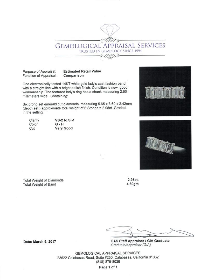 One electronically tested 14KT white gold lady's cast fashion band with a straight line with a bright polish finish. The featured lady's ring has a shank measuring 2.50 millimeters wide. Condition is new, good workmanship. Containing: Six prong set emerald cut diamonds, measuring 5.65 x 3.60 x 2.42mm (depth est.) approximate total weight of 6 Stones = 2.95ct. Graded in the setting. Color G - HClarity VS-2 to SI-1 Cut Very Good. Total Weight of Diamonds 2.95ct. Total Weight of Band 4.60gm. GAS Appraised.