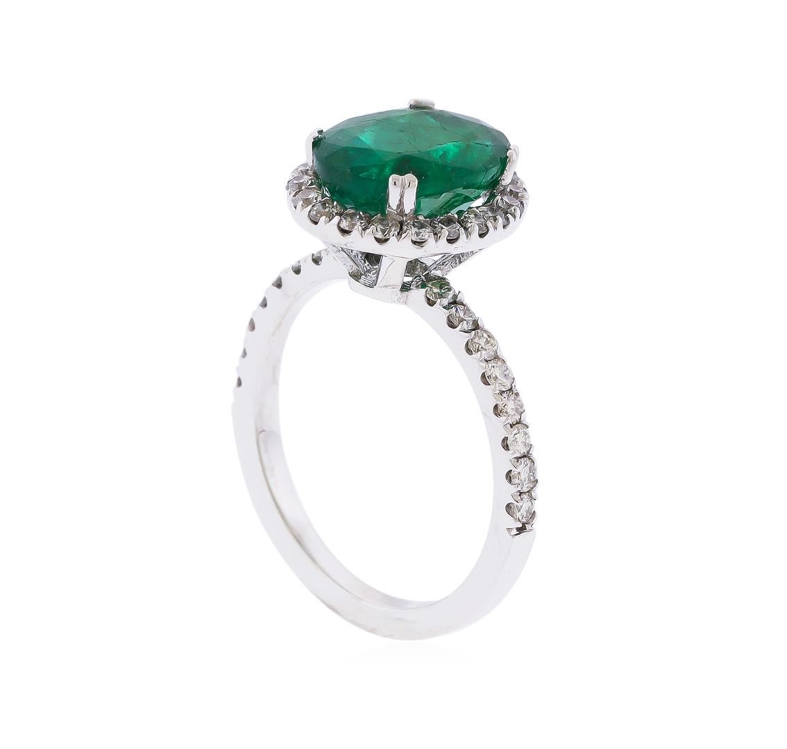 Fourteen karat (14K) white gold emerald and diamond ring. An oval cut emerald beryl gemstone is prong mounted in the center o' the ring and has an approximate weight of 2.95cts. Round brilliant cut diamonds accent the ring around and on both sides of the GGA Appraised at $3,680.00.