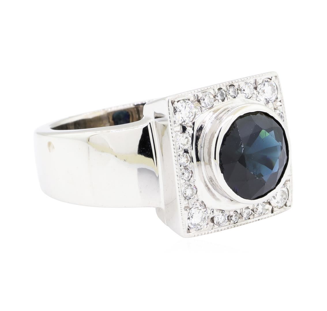One electronically tested 14KT white gold lady's combination cast & assembled fashion ring with a square halo with a bright polish finish. The featured lady's ring has a shank measuring 5.15 millimeters wide. Identified with markings of '14K'. Condition is new, good workmanship. Containing: One bezel set round modified mixed cut natural blue sapphire, measuring 8.75 - 8.70 x 4.83 mm, (depth est.) approximate weight of 2.96ct., clarity is heavily included, very dark, strong, blue color, (GIA B 8/5), cut is good. Transmitting light somewhat diffusely, semi-transparent to translucent. Naturally occurring internal & external characteristics are present. Indications of laboratory high temperature heat treatment. Colored gemstones are presumed to have been subjected to commonly used enhancement processes. Graded in the setting. Four prong set round brilliant cut diamonds, measuring 2.50 - 2.45 x 1.54mm (depth est.) approximate total weight of 4 Stones = 0.23ct. Graded in the setting. Color G - H Clarity VS-2 to SI-1 Cut Good Sixteen prong set round brilliant cut diamonds, measuring 1.50 - 1.20 x 0.84mm (depth est.) approximate total weight of 16 Stones = 0.15ct. Graded in the setting. Color H - I Clarity SI-1 to SI-2 Cut Good. Total Weight of Colored Stones 2.96ct.. Total Weight of Diamonds 0.38ct.. Total Weight of Ring 11.80gm. GAS Appraised.