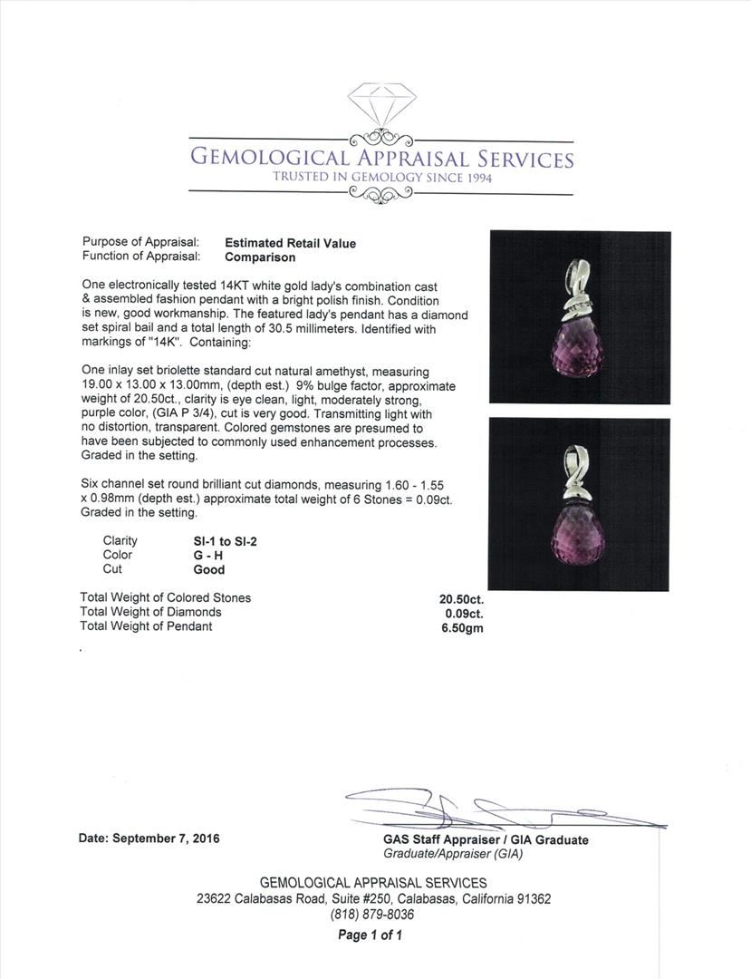 One electronically tested 14KT white gold lady's combination cast & assembled fashion pendant with a bright polish finish. The featured lady's pendant has a diamond set spiral bail and a total length of 30.5 millimeters. Identified with markings of "14K". Condition is new, good workmanship. Containing: One inlay set briolette standard cut natural amethyst, measuring 19.00 x 13.00 x 13.00mm, (depth est.) 9%. bulge factor, approximate weight of 20.50ct., clarity is eye clean, light, moderately strong, purple color, (GIA P 3/4), cut is very good. Transmitting light with no distortion, transparent. Colored gemstones are presumed to have been subjected to commonly used enhancement processes. Graded in the setting.Six channel set round brilliant cut diamonds, measuring 1.60 - 1.55 x 0.98mm (depth est.) approximate total weight of 6 Stones = 0.09ct. Graded in the setting. Clarity: SI-1 to SI-2. Color: G - HCut Good. Total Weight of Colored Stones 20.50ct. Total Weight of Diamonds 0.09ct. Total Weight of Pendant 6.50gm. GAS Appraised.