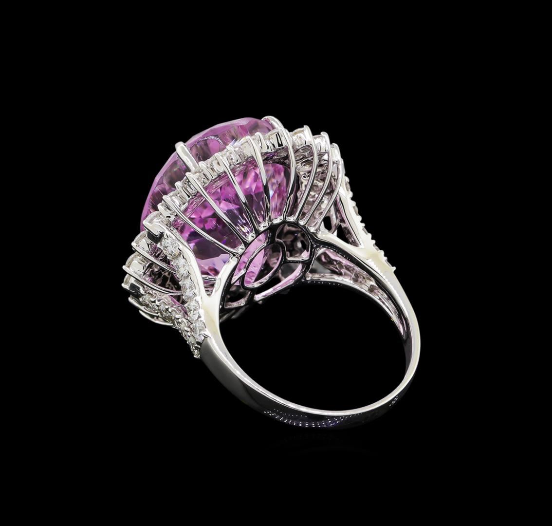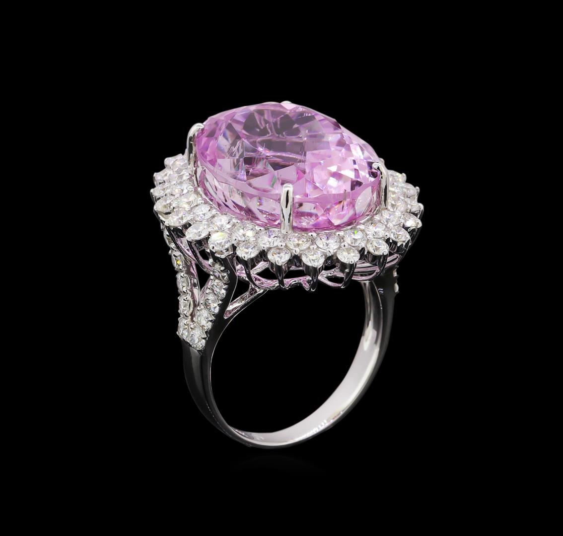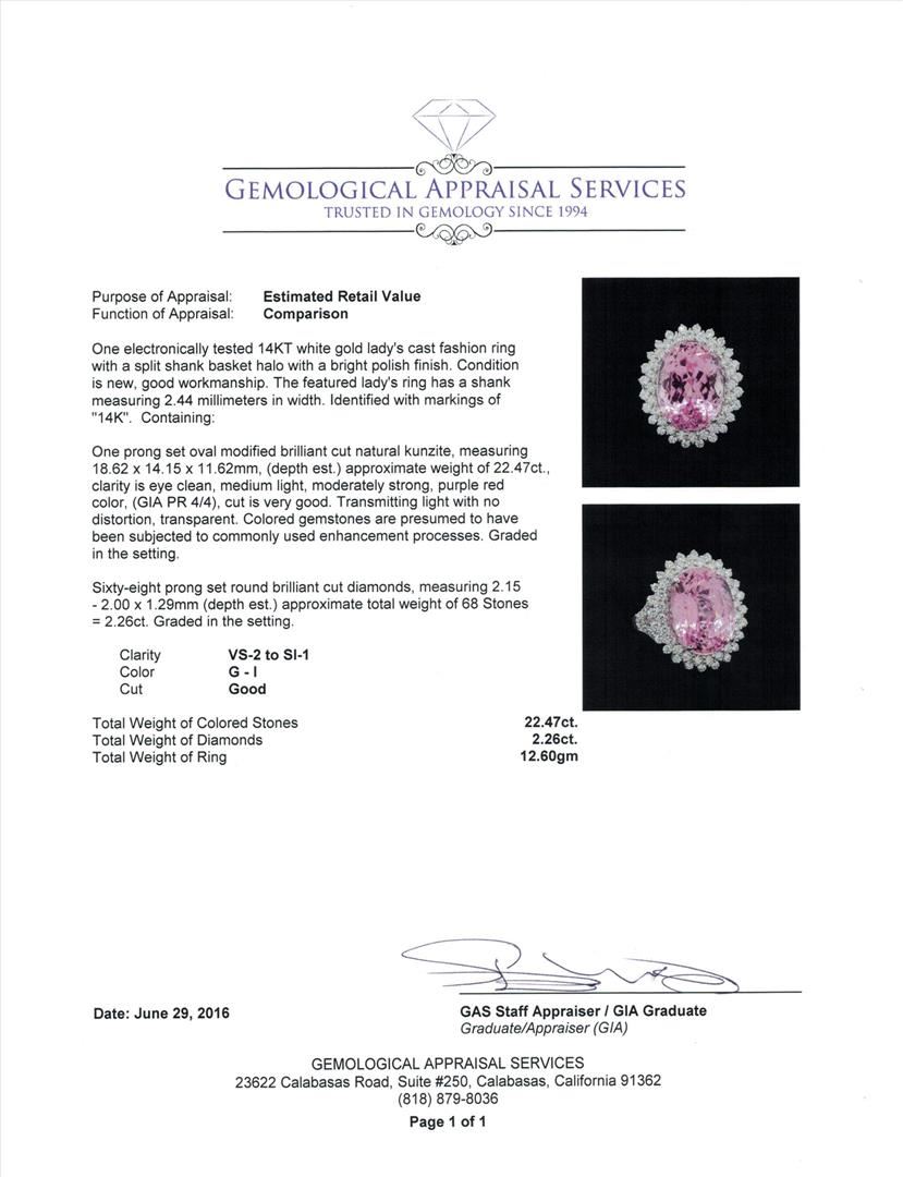 One electronically tested 14KT white gold lady's cast fashion ring with a split shank basket halo with a bright polish finish. The featured lady's ring has a shank measuring 2.44 millimeters in width. Identified with markings of "14K". Condition is new, good workmanship. Containing: One prong set oval modified brilliant cut natural kunzite, measuring 18.62 x 14.15 x 11.62mm, (depth est.) approximate weight of 22.47ct., clarity is eye clean, medium light, moderately strong, purple red color, (GIA PR 4/4), cut is very good. Transmitting light with no distortion, transparent. Colored gemstones are presumed to have been subjected to commonly used enhancement processes. Graded in the setting.Sixty-Eight prong set round brilliant cut diamonds, measuring 2.15 - 2.00 x 1.29mm (depth est.) approximate total weight of 68 Stones = 2.26ct. Graded in the setting. Clarity: VS-2 to SI-1. Color: G - ICut Good. Total Weight of Colored Stones 22.47ct. Total Weight of Diamonds 2.26ct. Total Weight of Ring 12.60gm. GAS Appraised.