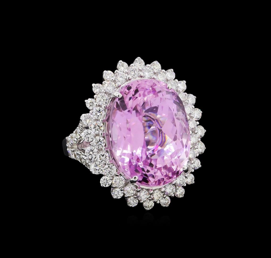 One electronically tested 14KT white gold lady's cast fashion ring with a split shank basket halo with a bright polish finish. The featured lady's ring has a shank measuring 2.44 millimeters in width. Identified with markings of "14K". Condition is new, good workmanship. Containing: One prong set oval modified brilliant cut natural kunzite, measuring 18.62 x 14.15 x 11.62mm, (depth est.) approximate weight of 22.47ct., clarity is eye clean, medium light, moderately strong, purple red color, (GIA PR 4/4), cut is very good. Transmitting light with no distortion, transparent. Colored gemstones are presumed to have been subjected to commonly used enhancement processes. Graded in the setting.Sixty-Eight prong set round brilliant cut diamonds, measuring 2.15 - 2.00 x 1.29mm (depth est.) approximate total weight of 68 Stones = 2.26ct. Graded in the setting. Clarity: VS-2 to SI-1. Color: G - ICut Good. Total Weight of Colored Stones 22.47ct. Total Weight of Diamonds 2.26ct. Total Weight of Ring 12.60gm. GAS Appraised.