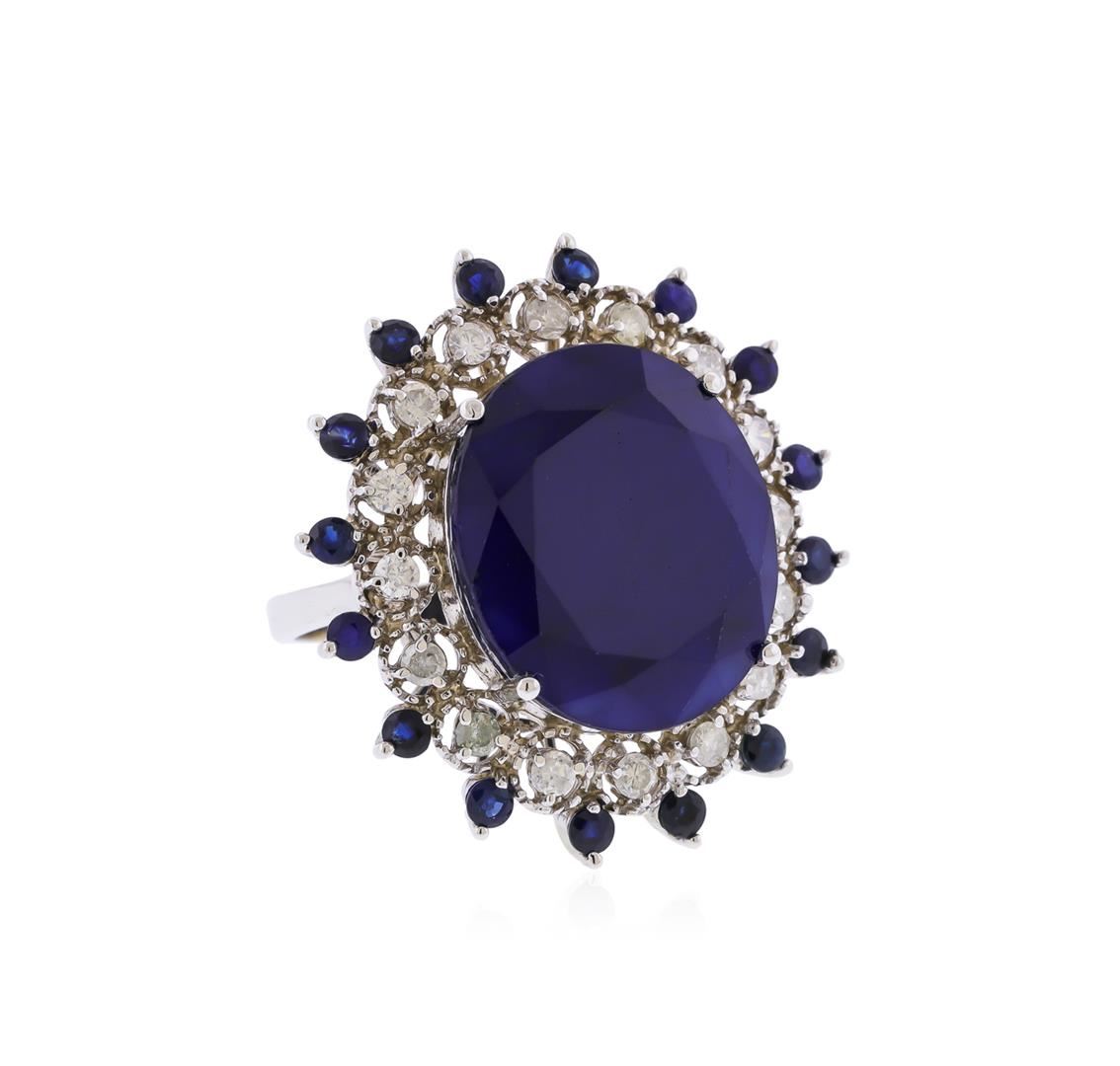 One polished, stamped, and tested 14K white gold ring mounted with: 17 faceted genuine blue sapphires weighing approximately 26.70 carats, and 16 faceted round diamonds weighing approximately 0.66 carats, average clarity of SI1-SI3, average color of G-I. This item weighs 12.6 grams, condition is new, very good workmanship. AIGL Appraised at $9,985.00.
